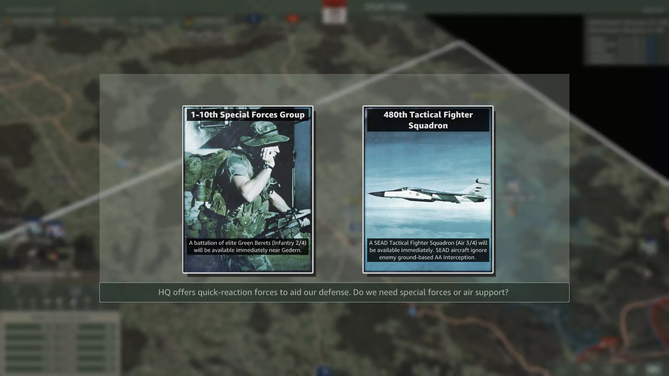 该选哪一个? 绿色贝雷帽很有趣,在城镇中能成为强大战力,也可作为坦克营的支援力量。 但在富尔达战役中,华约带来了不少于六个防空营,如果你想充分利用其他四个航空联队,就迫切需要第480战术战斗机中队提供的额外防空压制。 第六回合