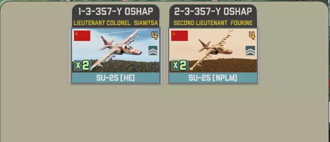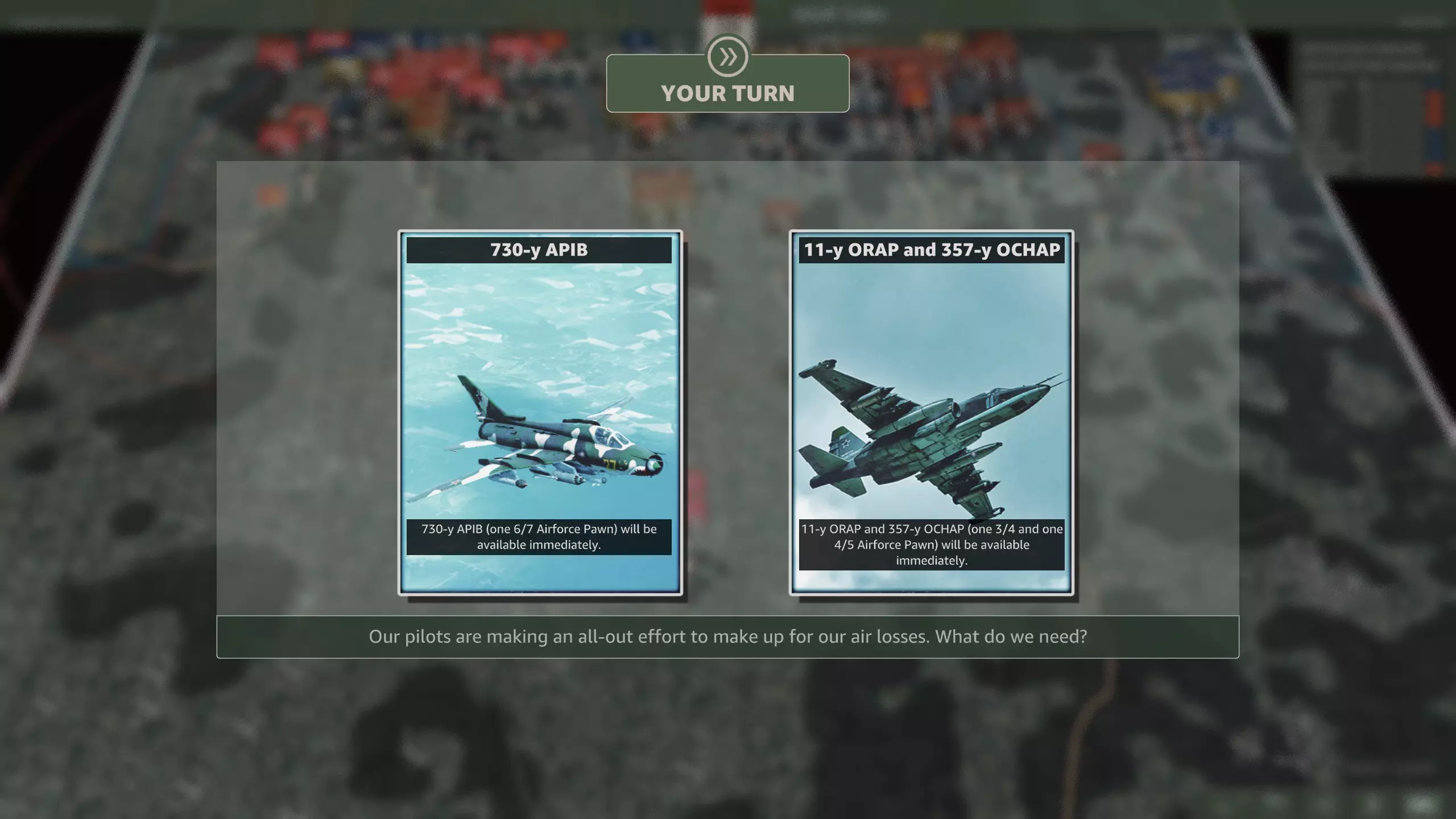 第8回合会提供与另一方相同的选择,即一次性使用一支强大的空中联队,或者获得一些胜利点。在这种情况下,胜利点为3个。 357-y OCHAP带来16架苏-25,包括反坦克型、集束炸弹型、高爆弹型、火箭弹型和凝固汽油弹型等多种型号。 其中有两支联队为反坦克型。