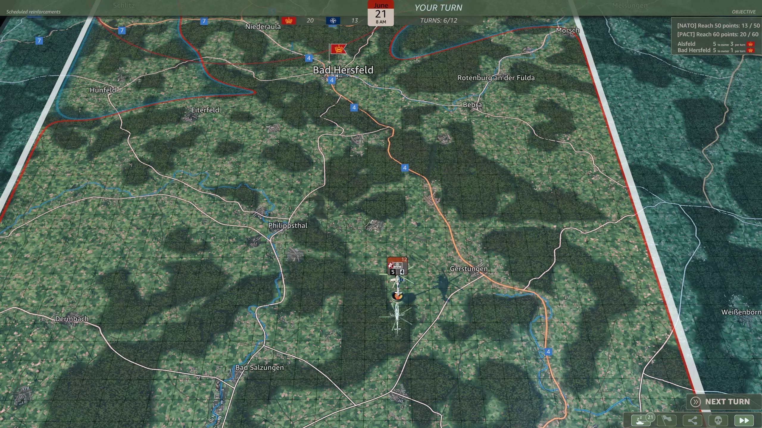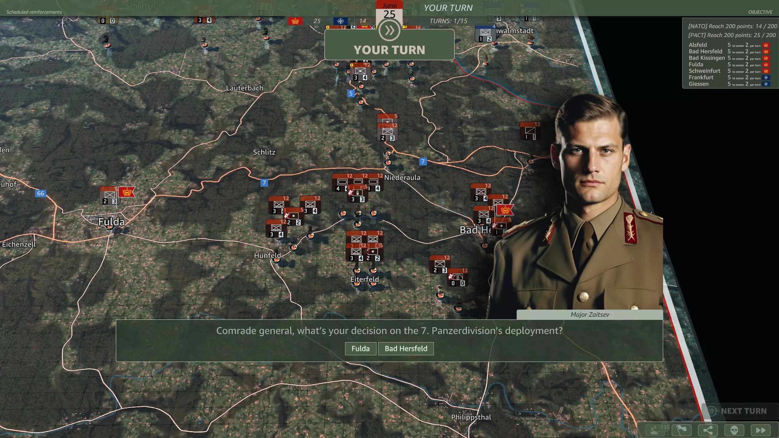 你的选择是富尔达或巴特黑斯费尔德。 你应该选择哪一个? 富尔达更靠近实力强大得多的苏联军队,但能够增援薄弱的南部侧翼。 巴特黑斯费尔德可以帮助你守住将面临巨大压力的阿尔斯费尔德。 装甲狂怒
