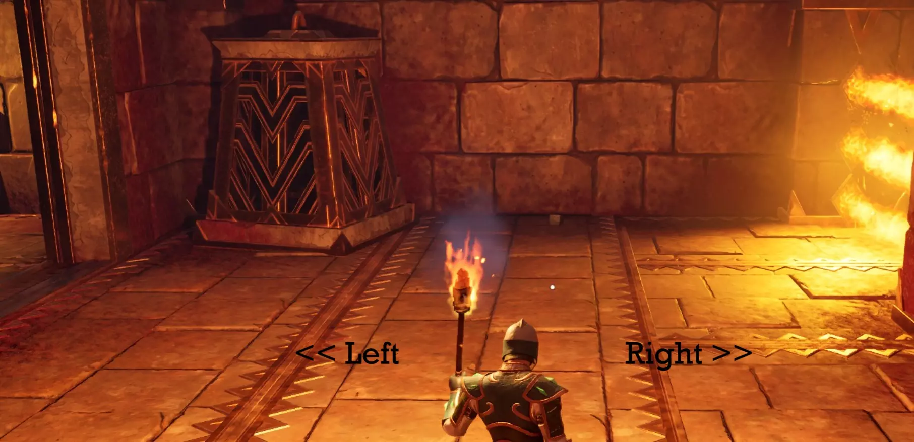如果你继续往前走,会遇到几个旋转的火焰陷阱。转身回到你之前经过的两座雕像那里。