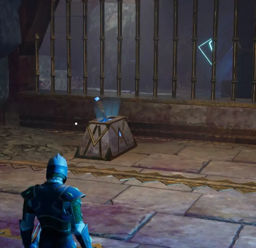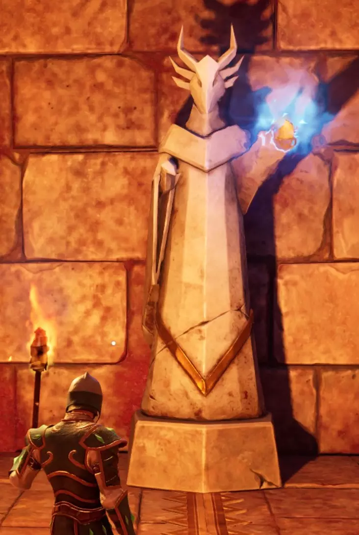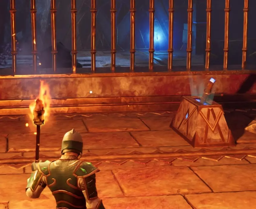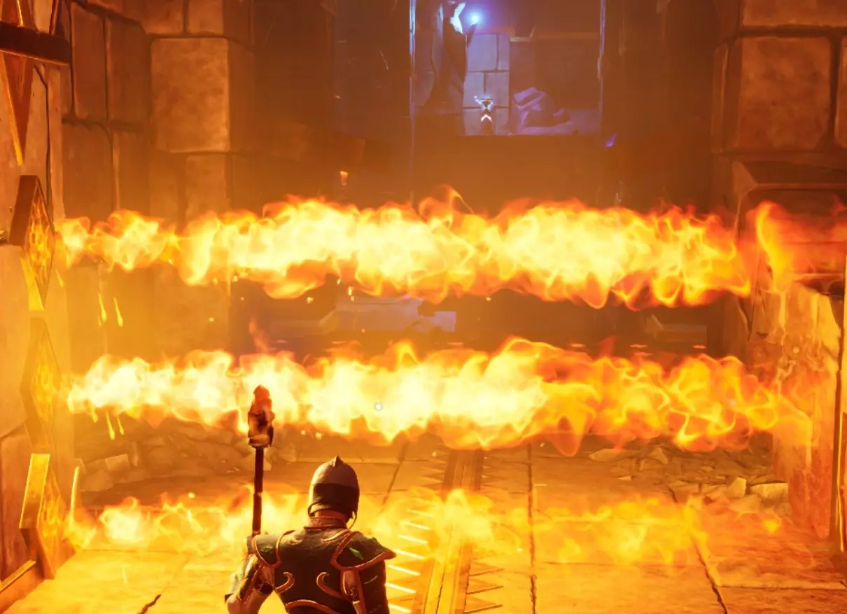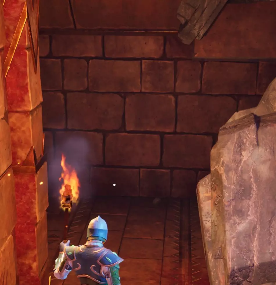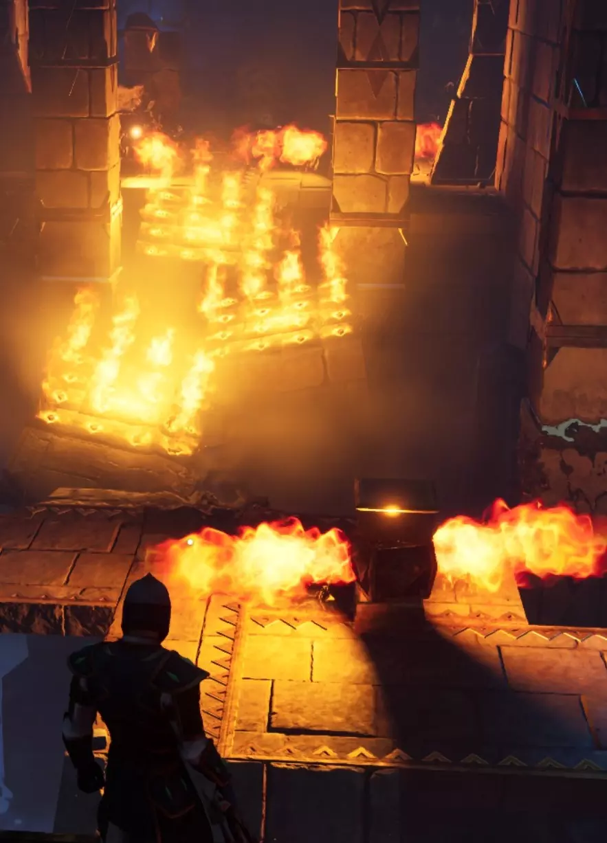 你前方的火焰陷阱和龙人雕像附近的旋转火焰陷阱会通向同一个地方,所以只需突破其中一个,然后继续沿着路径前进。 下楼后你会发现另一个火焰陷阱,穿过它后,左侧有一面可破坏的墙壁,破坏后里面有一些铁矿节点和一只老鼠。继续前进,你会遇到两个拉杆中的第一个。拉动它,返回起始区域,然后进入右侧区域。