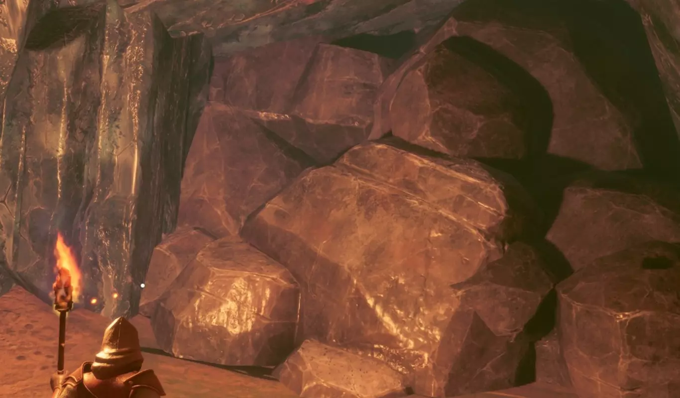 一路劈砍,点燃火把后进入内部。穿过那些铁质节点,你会遇到一块巨大的可破坏岩石。是时候拿出你崭新的铁镐,或者使用岩石爆破法术来清除这个障碍了。