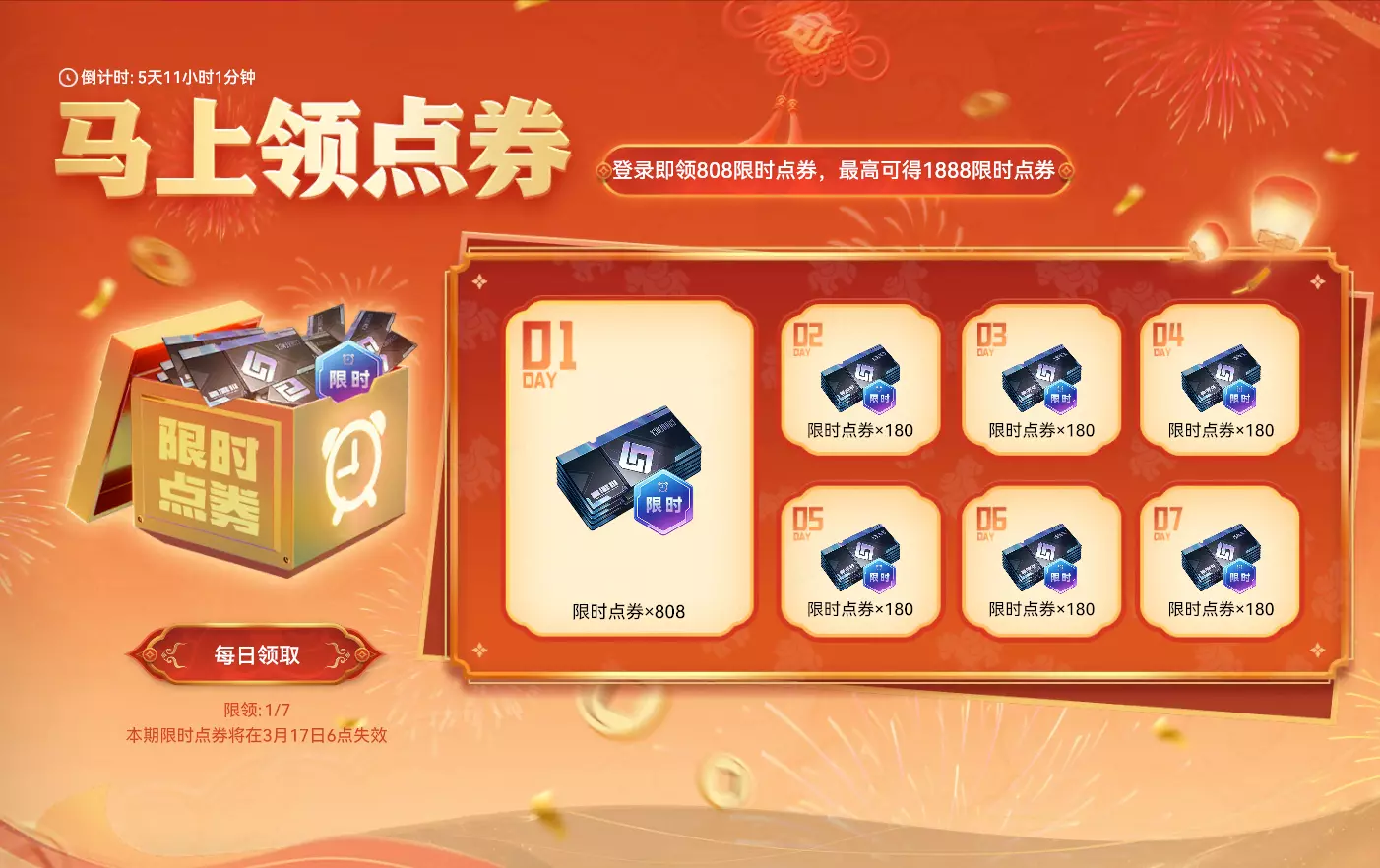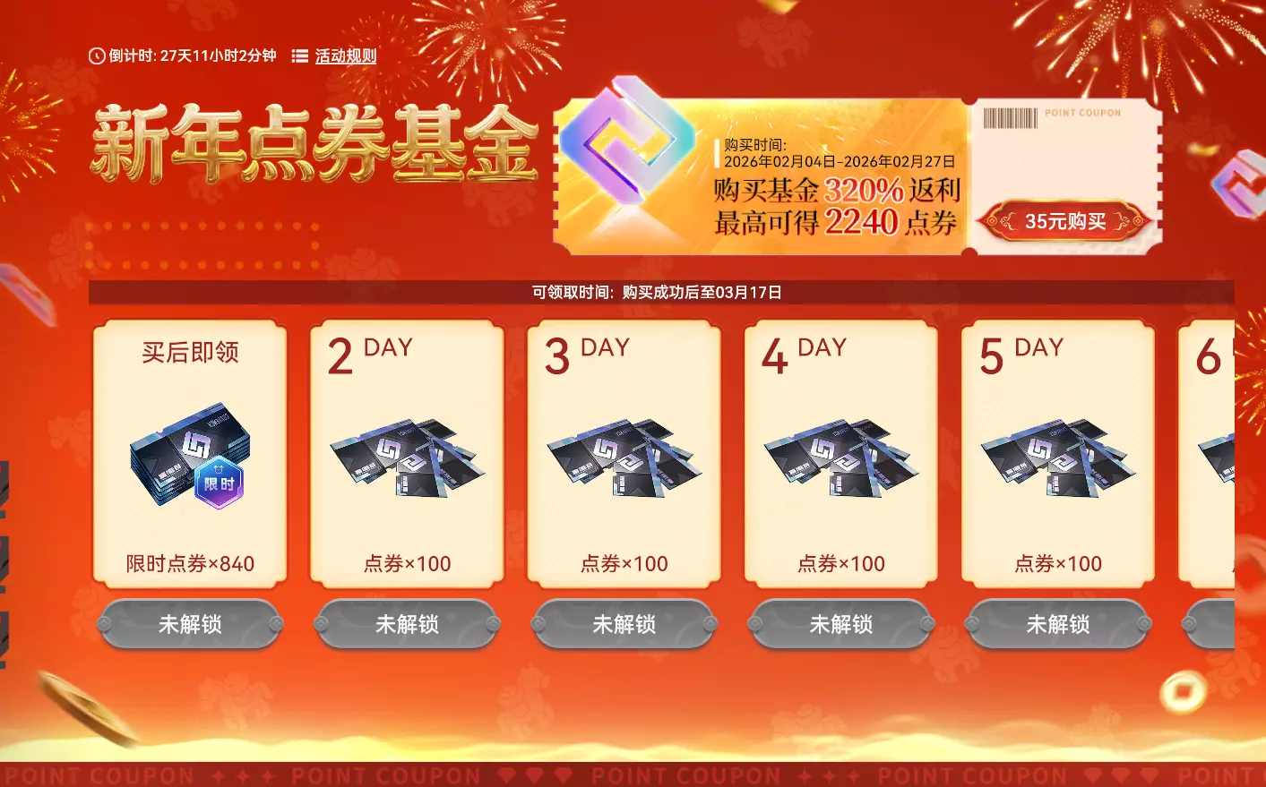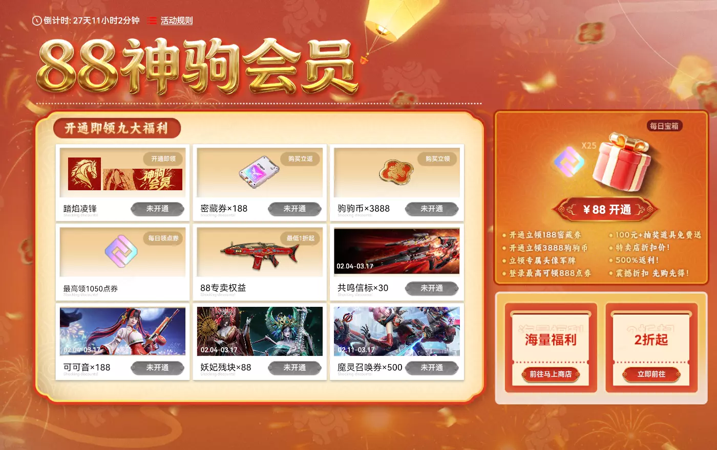 【88特惠专卖】 活动时间:2026年2月4日7点-2026年3月17日23:59:59 活动奖励: 【新年点券基金】 活动时间:2026年2月4日7点-2026年3月17日23:59:59 活动奖励: