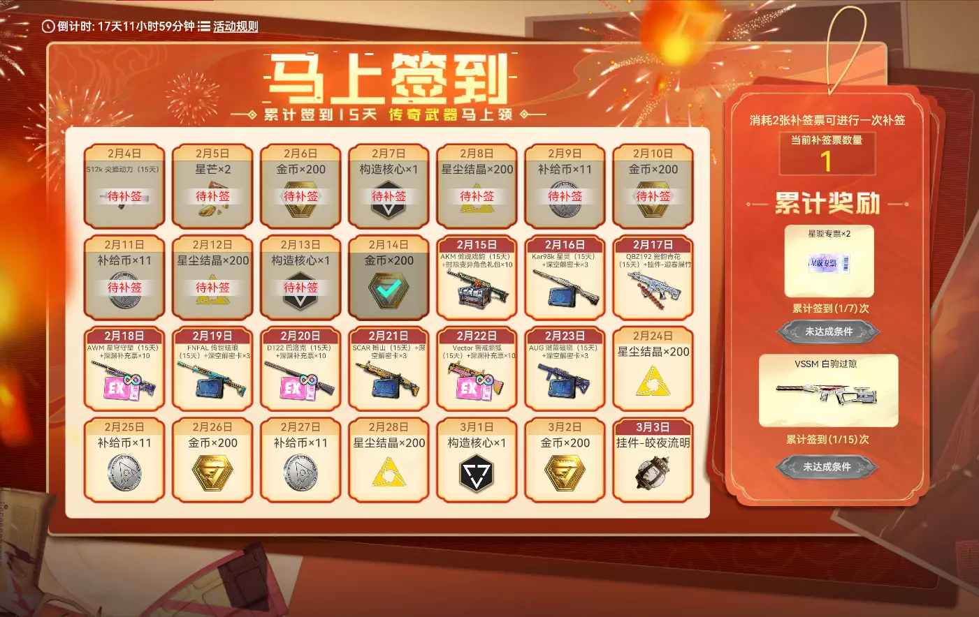 【马上签到】 活动时间:2026年2月4日7点-2026年3月3日23:59:59 活动规则: 1. 活动期间,在指定日期登录可领取对应奖励 2. 每日登录可获得补签票×1 3. 如果错过对应日期的签到,可消耗补签机会补签 4. 累计完成一定数量的登录任务可领取阶段奖励 5. VSSM 白驹过隙将于3月18日加入荣耀战备-积分商城 活动奖励: