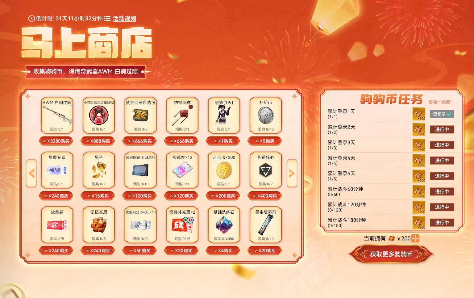 【马上商店】 活动时间:2026年2月4日7点-2026年3月17日23:59:59 活动规则: 1. 活动期间,完成任务可获得驹驹币,购买神驹会员等也可以获得驹驹币 2. 消耗驹驹币可在马上商店中兑换奖励 3. 活动期间可消耗点券*1购买驹驹币*1 4. AWM 白驹过隙将于3月18日加入荣耀战备-积分商城 活动奖励: