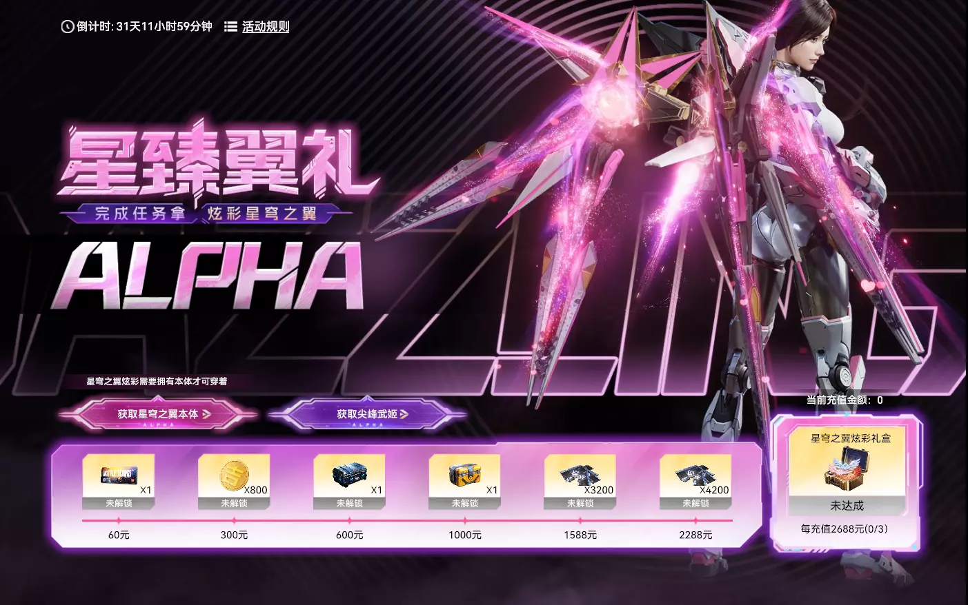 【星臻翼礼】 活动时间:2026年2月4日7点-2026年3月17日23:59:59 活动规则: 1. 活动期间,完成充值任务即可领取对应奖励 2. 星穹之翼炫彩礼盒:有概率获得以下1种奖励:星穹蓝晶*1、星穹红晶*1、星穹粉晶*1 3. 传奇投掷物自选箱:打开后可在破片手雷-疯狂南瓜、破片手雷-怒龙、烟雾弹-战争游戏、烟雾弹-幸运雪球、燃烧弹-月香兔影、闪光弹-赛博幻音中自选1个奖励获得 4. 炫彩传奇武器自选箱:打开可选择其中一个获得:FAMAS 星穹武士、MP5A3 白虎巡天、TWS 灵魂深寒、Type56 巴洛克、RPK 虫群复苏、Glock18C 空中派对、DT22 夸父逐日、Kar98K 狂暴引擎、ASVAL 希望之翼、复合弩 阴阳造化、NAR-10木染靛青、左轮【青鸾衔翠】、如意火铳【金玉狮缘】、92FS【心魔天引】、烟雾弹【灰烬重生】、双爪刃【蓝星守望】、M1911【青帝东来】、AA-12【紫青重甲】、OM50【水调幽蓝】、沙漠之鹰【果漾青春】 活动奖励: