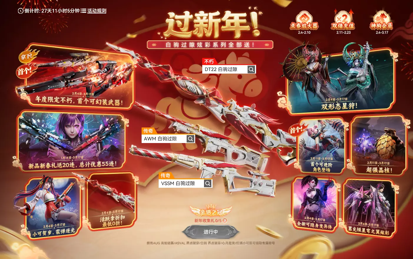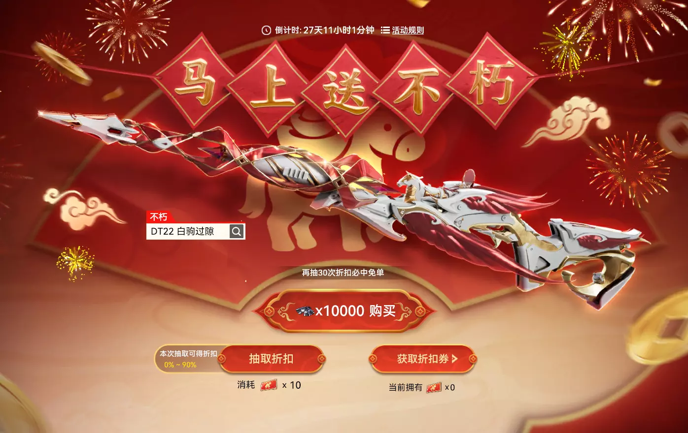 活动时间:2026年2月4日7点-2026年3月17日23:59:59 活动规则: 1. 活动期间,完成任务可以获得折扣券 2. 消耗折扣券*10可在活动界面抽取一次折扣 3. 每次抽取折扣都有概率获得任意一个折扣 4. 消耗点券可使用对应折扣购买武器 5. 累计抽取30次必定可抽到免单折扣 6. DT22 白驹过隙将于3月18日加入荣耀战备-积分商城 活动奖励: