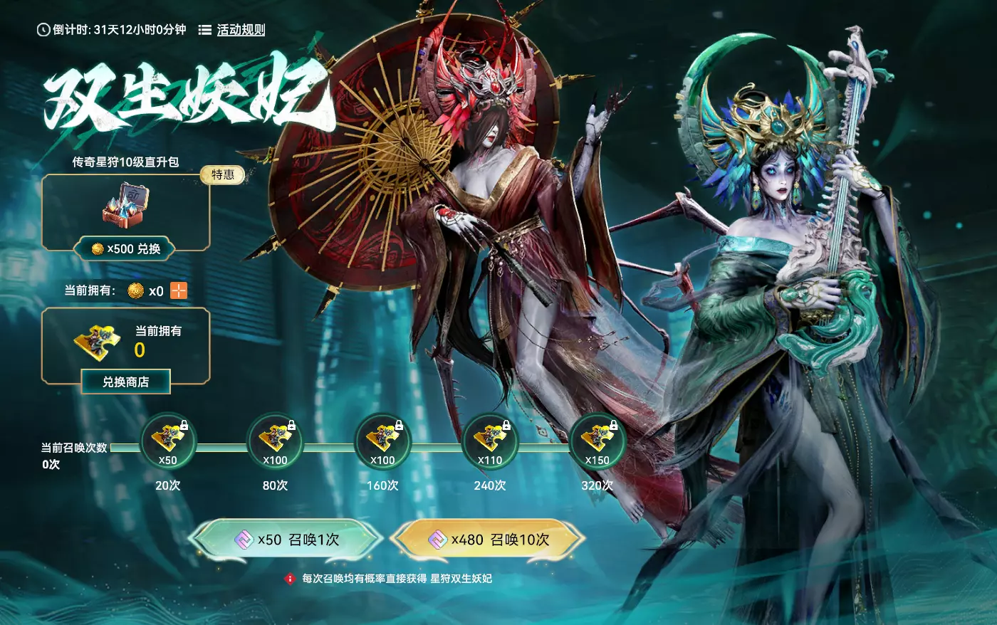 【全新星狩 双生妖妃】 活动时间:2026年2月4日7点-2026年3月17日23:59:59 活动规则: 1. 活动期间,消耗50点券可进行1次召唤,消耗480点券可进行10次召唤 2. 召唤到达不同次数,可额外领取【妖妃残块】 3. 每次召唤可获得【妖妃残块】5~200个,且均有机会直接获得星狩 双生妖妃 4. 消耗【妖妃残块】可在兑换商店中兑换指定物品,活动结束后,【妖妃残块】将过期并失效,请及时使用 5. 活动期间,可花费拍卖币500购买传奇星狩10级直升包(限购1次),内含狩能粉尘18500+狩能晶石75+狩能晶髓12+狩能晶魄1 活动奖励: