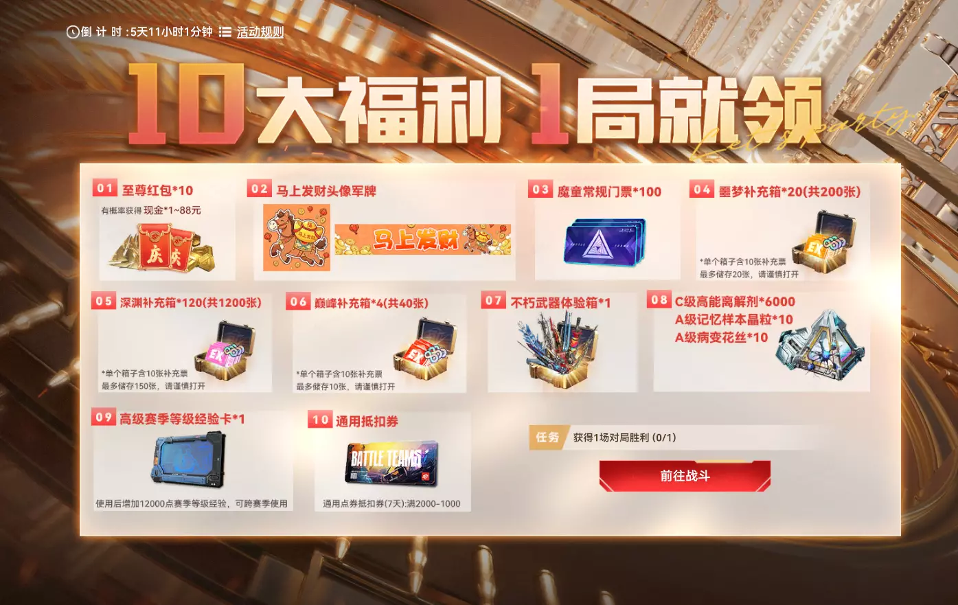 【10大福利 1局就领】 活动时间:2026年2月4日7点-2026年2月23日23:59:59 活动奖励: