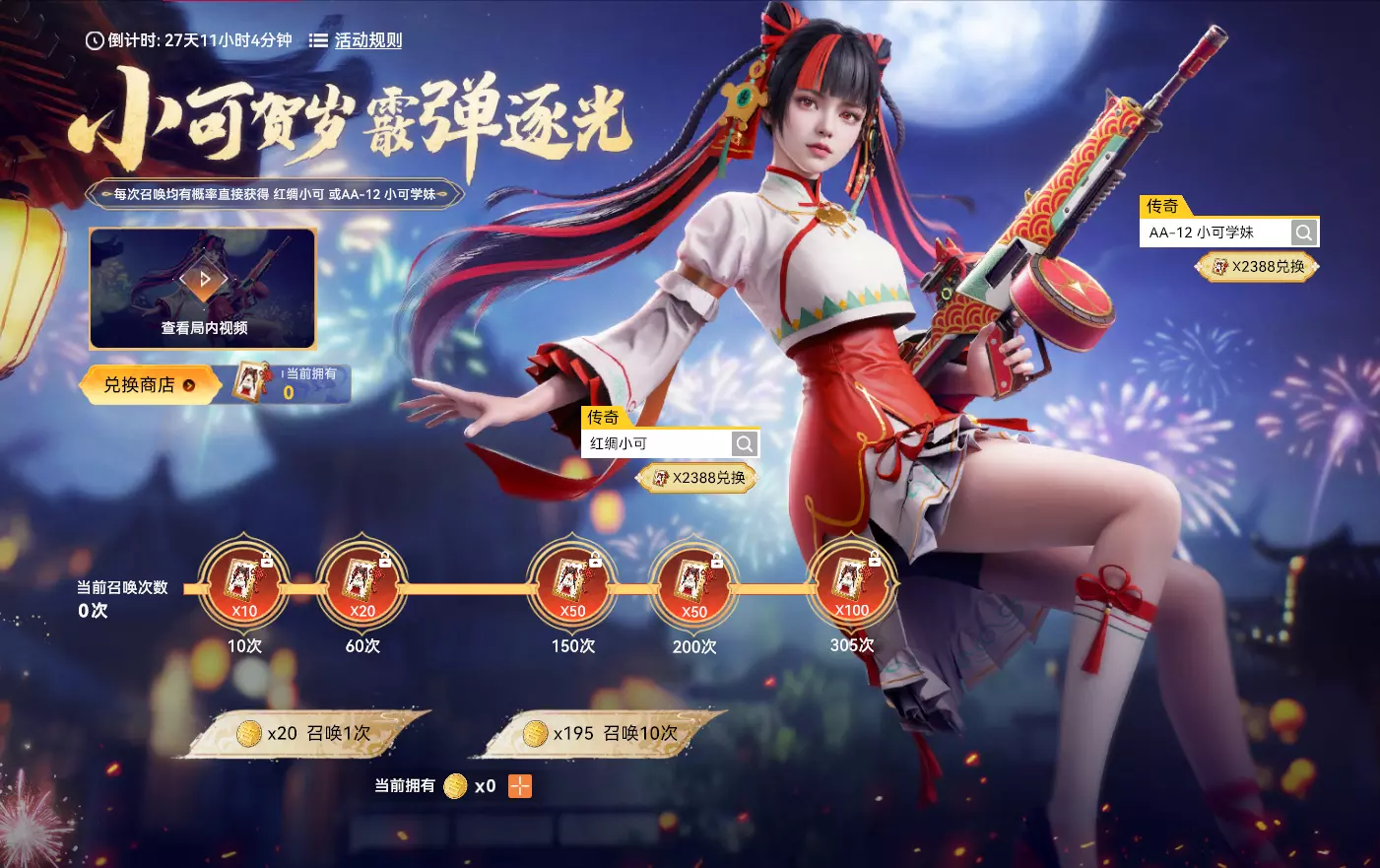 【小可贺岁 霰弹逐光】 活动时间:2026年2月4日7点-2026年3月17日23点59分59秒 活动规则: 1. 花费吉吉币×20可进行1次召唤,或花费吉吉币×195进行10次召唤 2. 进行召唤到达不同次数,可额外领取【可可音】 3. 每次召唤可得可可音×16~200,且均有机会直接获得角色皮肤【红绸小可】或传奇武器【AA-12 小可学妹】 4. 消耗可可音可在兑换商店中兑换指定物品,活动结束后,可可音将过期并失效,请及时使用 活动奖励: