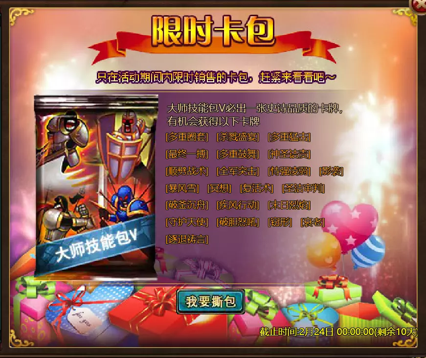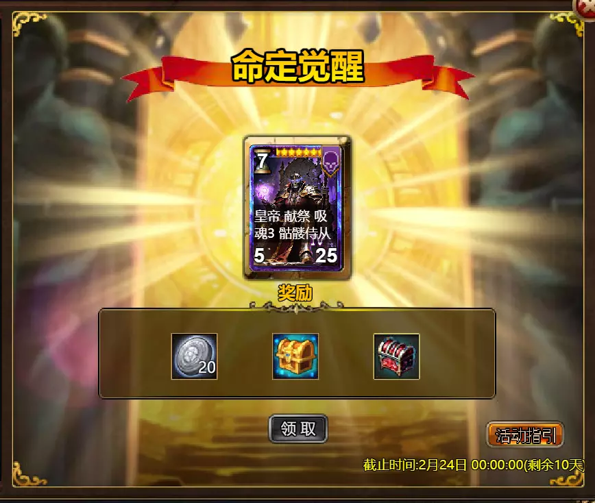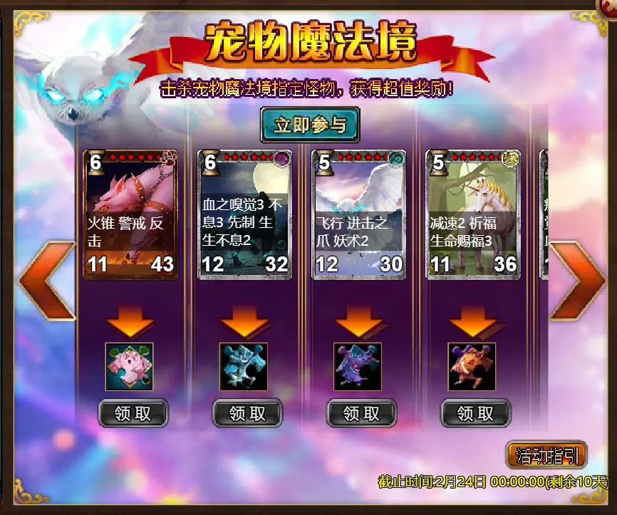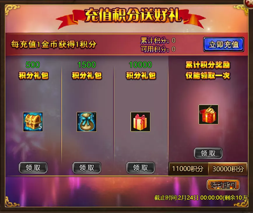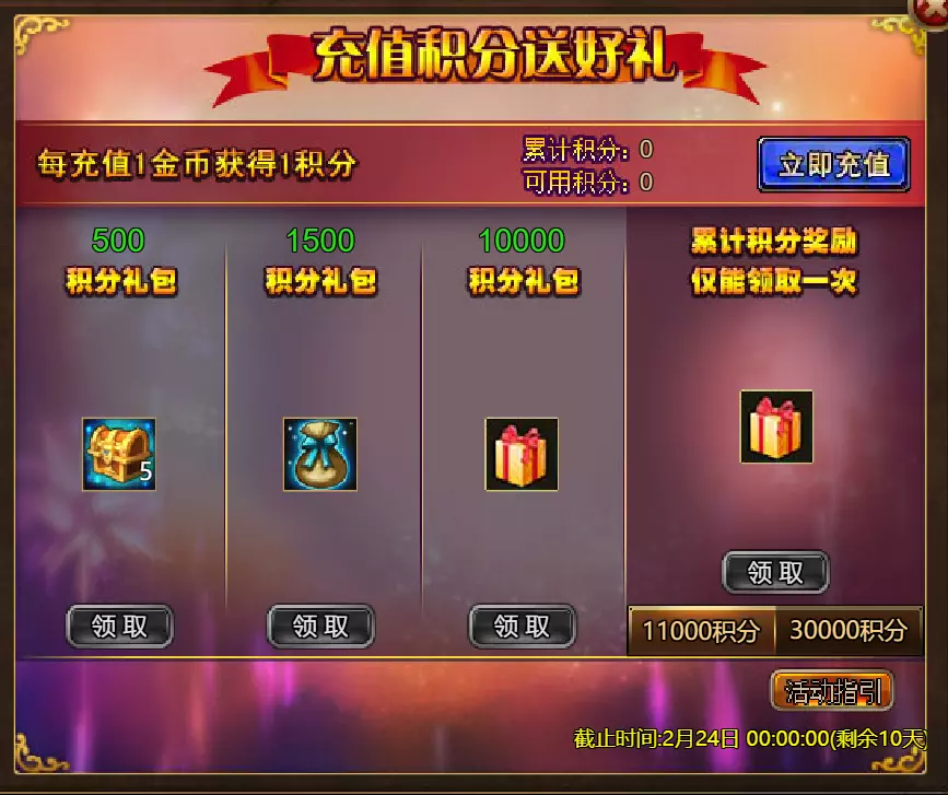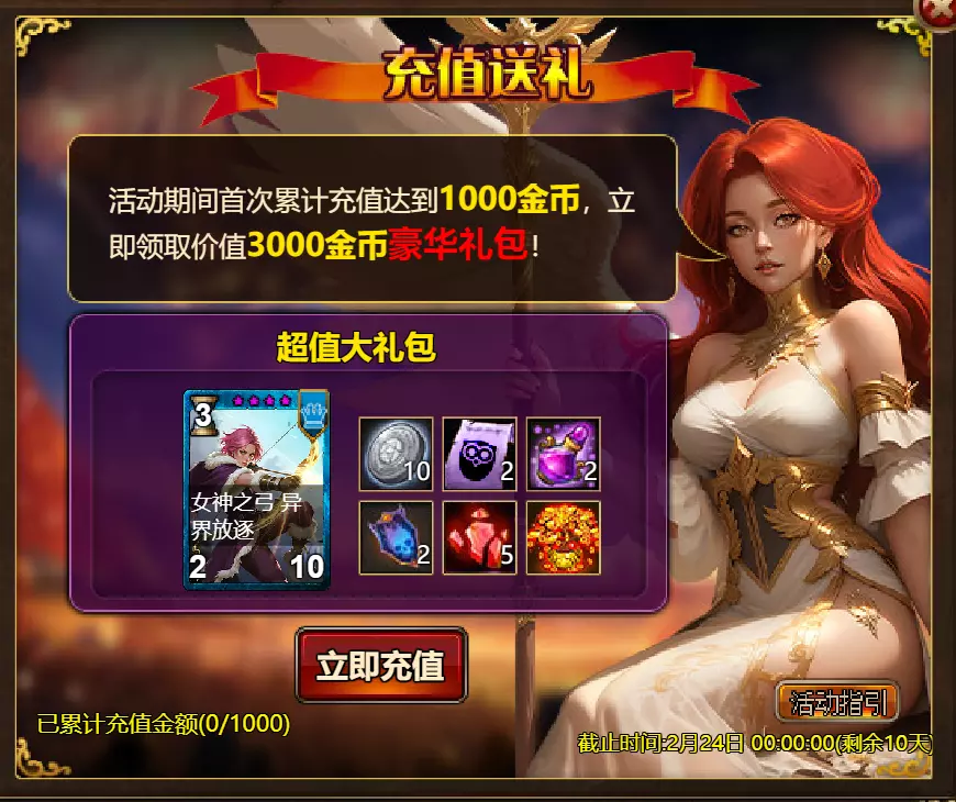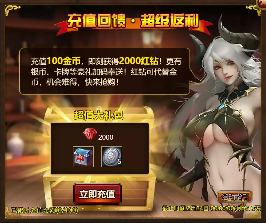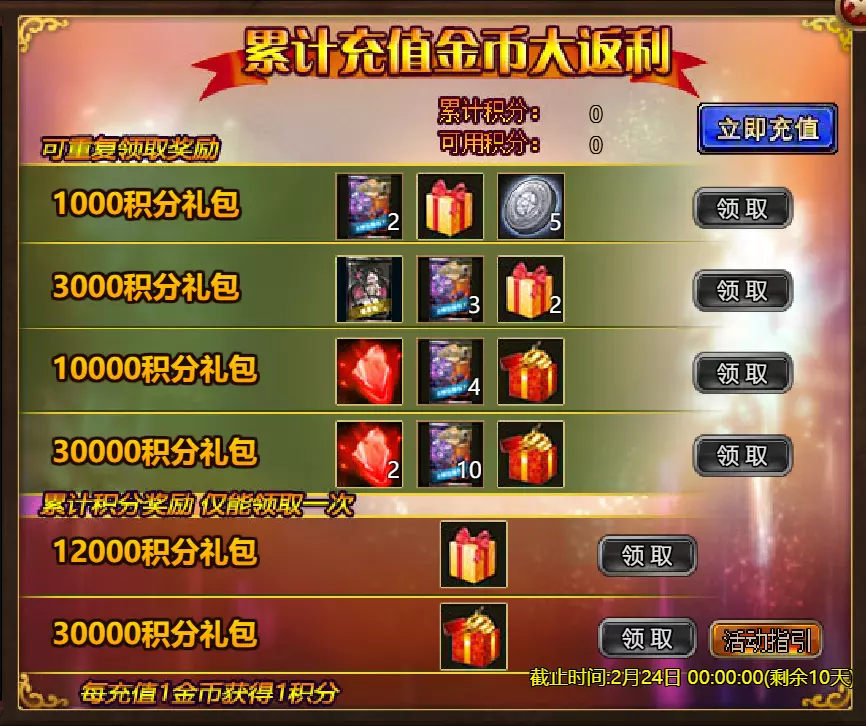 《火焰征程》限时活动更新公告 北京时间2026年2月17日0:00将更新《火焰征程》限时活动,本次更新主要内容如下: 【活动】 1. 至高之战:Volante Voidstep 2. 红钻风暴:红钻*2000/龙箱*1/银币*50000 3. 充值返利:弓箭手薇拉(史诗)*1/银币*100000/宠物魔法领域门票*2/黑暗冠军药水*2/ tome hall门票*2/红宝石碎片*5/黄金树*1 4. 购买积分,获取奖励:11000积分可兑换传说年兽宝箱(内含传说年兽*1、传说辞旧迎新*1)*1;30000积分可兑换神级年兽宝箱(内含神级年兽*1、神级辞旧迎新*1)*1累计黄金返利:12000 - 传说级龙卷风巫师5982宝箱(内含龙卷风巫师5982(传说级)*1、黄金树*2)*1 / 30000 - 神圣级龙卷风巫师5982宝箱(内含龙卷风巫师5982(神圣级)*1、黄金树*6)*1 6.20天基金 7.宿命觉醒(帝王) 8.超值返利 9.传奇故事(全能之父奥丁) 10.马鬃事件 11.黄金狂潮(每周活动) 消耗10000金币:火花 stride 称号卡*1、太阳宝箱(传说级)*2宠物愉悦*1 消耗30000金币:火焰红宝石*2,神级宝箱II*2,银币*3000000 消耗50000金币:黑欧泊*1,太阳宝箱(传说)*4,宠物愉悦*5 消耗70000金币:火焰红宝石*2,神级宝箱II*4,银币*4000000 消耗900000金币:黑欧泊*1,神级宝箱II*6,太阳宝箱(传说)*6,银币*5000000每日消费,领取奖励 消费100金币:融合催化剂*1,银币*10000,塔楼门票*3 消费500金币:人类宝箱(稀有)*1,融合催化剂*2,地狱门票*2 消费1000金币:宠物魔法领域门票*2,天使宝箱(稀有)*2,爆竹符文配方(史诗)*2 消费2000金币:月亮宝箱(史诗)*1,饲料(传说)*10,宠物零食*1 消费5000金币:宠物魔法领域门票*3,未绑定技能书碎片(良好)*10,火蛋白石*1 消费10000金币:火红宝石*1,高级融合催化剂*1,银币*1000000【限时活动礼包】- 增益狂欢 - 20个专属礼包:神力宝箱II*2 / 银币*2,000,000 - 20个大师技能礼包V:大师技能礼包V*10 / 银币*1,000,000 - 20个神秘人类礼包III:超级虚空礼盒*2 / tome hall门票*3 / 门票礼包*2 - 5个勇者礼包:tome hall门票*2 / 能量药剂(10点)*3 / 银币*300,000 - 10个精英礼包:集会指令*3 / 银币*80,000 14.宠物魔法领域 15.国王陵墓 16.特别福利 详情请见图片。活动内容以游戏内为准,官方拥有最终解释权。