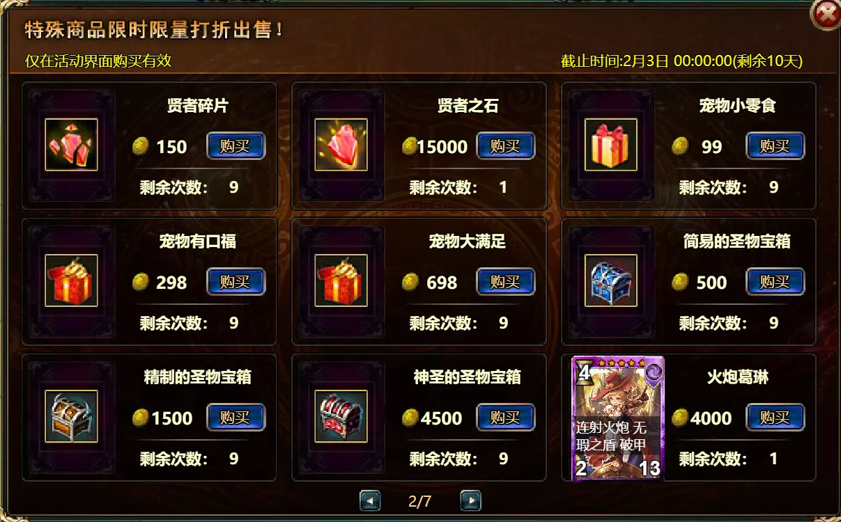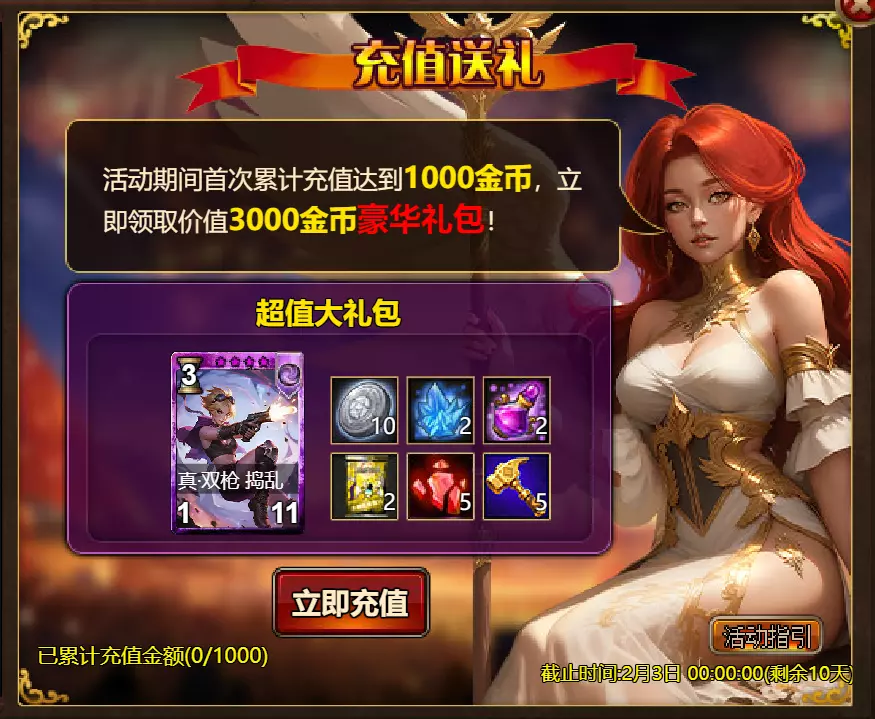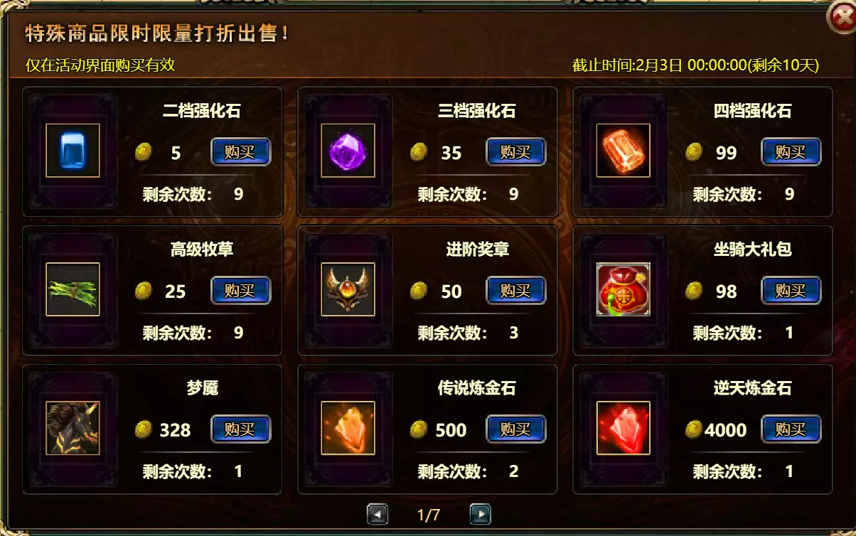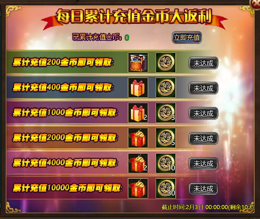 【维护公告】 各位玩家: 我们将于北京时间2026年1月27日上午9:30至11:30进行维护更新。具体维护进度可能会根据实际情况提前或延后,感谢您的理解。维护期间游戏将无法登录,由此带来的不便我们深表歉意。 本次维护主要内容如下: 【更新】 1. 地狱塔:增加层数 【活动】 1. 至高之战:凯琳·罗克西亚 2. 红钻风暴:红钻*2000/龙箱*1/银币*50000 3. 充值返利:烈风穿刺者(史诗)/银币*100000/水晶礼包*2/黑暗冠军药水*2/大师技能包II*2/红宝石碎片*5/黄金 hammer*5购买点数,获取奖励:8000点数可获得【女王埃塞尔拉(传说级)】*1 / 30000点数可获得【女王埃塞尔拉(神级)】*1 5.累计金币返利:累计10000金币可获得【传说级兽神 kogarasho 宝箱】(内含【兽神 kogarasho(传说级)】*1、【黄金 hammer】*20)*1 / 累计30000金币可获得【神级兽神 kogarasho 宝箱】(内含【兽神 kogarasho(神级)】*1、【黄金 hammer】*60)*1 6.神秘宝箱 7.超值返利 8.神话图鉴(白泽) 9.足球活动 10.淘金热(周常活动) 消耗10000金币可获得:【黄金树】*1、【火焰红宝石】*1、【太阳宝箱(传说级)】*2宠物愉悦*1 消耗30000金币:火焰红宝石*2,神级宝箱II*2,银币*3000000 消耗50000金币:黑欧泊*1,太阳宝箱(传说级)*4,宠物愉悦*5 消耗70000金币:火焰红宝石*2,神级宝箱II*4,银币*4000000 消耗900000金币:黑欧泊*1,神级宝箱II*6,太阳宝箱(传说级)*6,银币*5000000每日消费,领取奖励 消费100金币:融合催化剂*1,银币*10,000,塔楼门票*3 消费500金币:人类宝箱(稀有)*1,融合催化剂*2,水晶礼包*1 消费1,000金币:水晶礼包*2,天使宝箱(稀有)*2,银币*50,000 消费2,000金币:月神宝箱(史诗)*1,素材(传说)*10,宠物零食*1 消费5,000金币:水晶礼包*3,未绑定技能书碎片(良好)*10,火蛋白石*1 消费10,000金币:火红宝石*1,高级融合催化剂*1,银币*1,000,000礼包(限时活动)- 增益狂欢 10份胜利礼包 - 稀有时装盒*1/银币*2,000,000 10份神秘哥布林礼包 - 月神宝箱(史诗)*2/火蛋白石*1/银币*500,000 20份专家礼包IV - 专家礼包IV*10/银币*1,000,000 20份勇者礼包 - tome大厅门票*2/水晶礼盒*8 10份精英礼包 - 职业选择水晶*3/银币*800,000 13.地狱塔 14.地下城复刻:年度灾厄追击 15.年度灾厄道具兑换 16.毒蛇娜佳:积分抽奖 17.远古巢穴 18.英雄降临 19.特惠商店 注意: 1.活动14(地下城复刻:年度灾厄追击)、15(年度灾厄道具兑换)和16(毒蛇娜佳:积分抽奖)的举办时间为2026年1月27日00:00至2026年2月10日00:00(北京时间)2.所有其他活动时间为2026年1月27日00:00至2026年2月3日00:00(北京时间)。详情请见图片。活动内容以游戏内实际内容为准,官方拥有最终解释权。