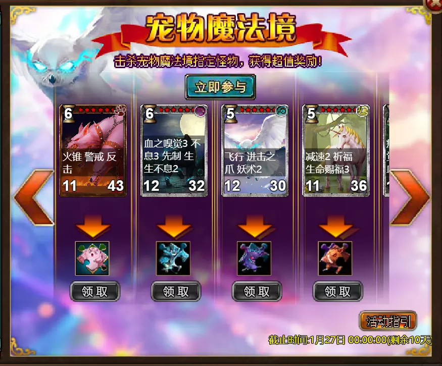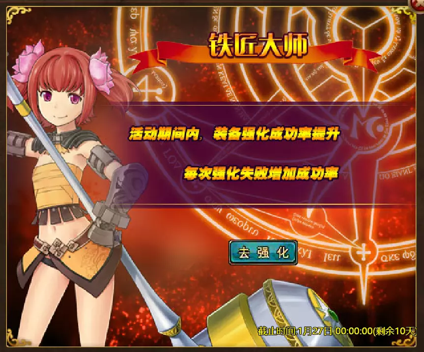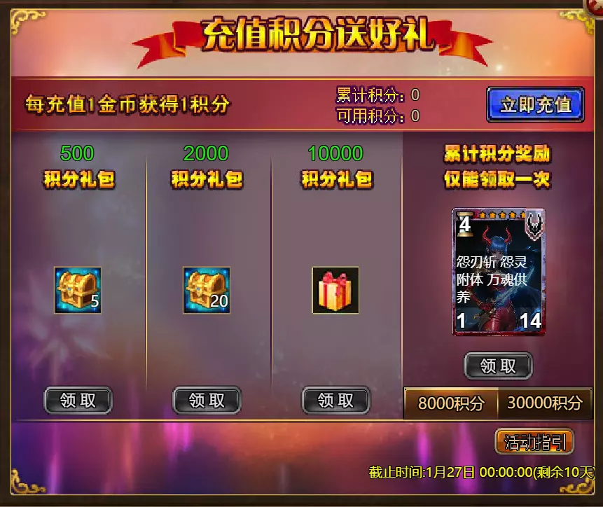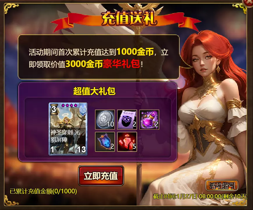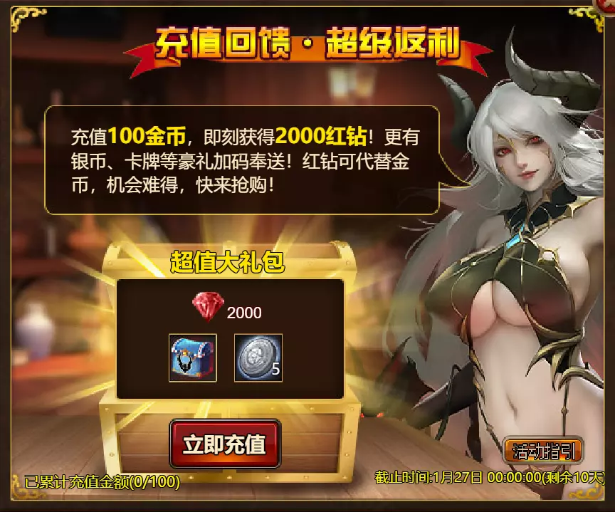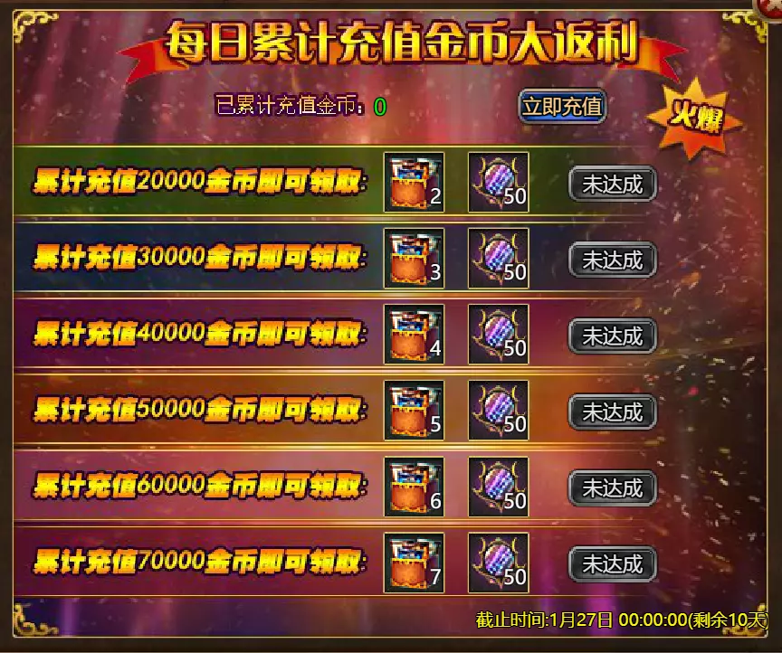 【维护公告】 各位玩家: 我们将于北京时间2026年1月20日上午9:30至11:30进行维护更新。具体维护进度可能会根据实际情况提前或延后,感谢您的理解。维护期间游戏将无法登录,由此带来的不便我们深表歉意。 本次维护主要内容如下: 【更新内容】 1. 新增季后赛1v1冠军时装及坐骑 2. 普通飞升塔新增自动功能 【活动内容】 1. 至高之战:丹妮卡·焰心 2. 红钻风暴:红钻*2000/恶魔宝箱*1/银币*50,000 3. 充值返利:烈焰翼使(史诗)*1/银币*100,000/宠物秘境券*2/黑暗冠军药剂*2/ tome hall ticket*2/红宝石碎片*5购买点数,获取奖励:8000 - 暗影之刃·死神(传说级)*1 / 30000 - 暗影之刃·死神(神圣级)*1 5.累计金币返利:10000 - 达尔王(传说级)*1 / 30000 - 达尔王(神圣级)*1 6.20日基金 7.传说商店 8.超值返利 9.塔罗奥秘(倒吊人逆位) 10.星辰事件 11.金币狂欢(周常活动) 消耗10000金币:火焰红宝石*1,太阳宝箱(传说级)*2,宠物愉悦*1 消耗30000金币:火焰红宝石*2,神圣宝箱II*2,银币*3000000 消耗50000金币:黑欧泊*1,太阳宝箱(传说级)*4,宠物愉悦*5 消耗70000金币:火焰红宝石*2,神圣宝箱II*4,银币*4000000 消耗90000金币:黑欧泊*1,神圣宝箱II*6,太阳宝箱(传说级)*6,银币*5000000 12.每日消费,领取奖励 消费100金币:融合催化剂*1,银币*10,000,塔楼门票*3 消费500金币:人类宝箱(稀有)*1,融合催化剂*2,地狱门票*2 消费1,000金币:宠物魔法领域门票*3,天使宝箱(稀有)*2,银币*50,000 消费2,000金币:月神宝箱(史诗)*1,饲料(传说)*10,地狱门票*5 消费5,000金币:宠物魔法领域门票*3,未绑定技能书碎片(良好)*10,火蛋白石*1 消费10,000金币:火红宝石*1,高级融合催化剂*1,银币*1,000,000【限时活动礼包】- 增益狂欢 - 2个专属礼包:神力宝箱II*2 / 银币*2,000,000 - 10个大师技能包VII:火焰鸟碎片*40 / 宠物盛宴*2 / 未绑定技能书碎片(优质)*5 - 20个头像包II:头像包II*10 / 银币*1,000,000 - 20个神秘野兽包II:蛋白石碎片*9 / 传说宝箱*2 / 银币*500,000 - 5个女巫包:能量药剂(10点)*3 / 法典大厅门票*2 / 银币*300,000 - 10个精英包:集结令*3 / 银币*800,000 14.宠物魔法领域 15.远古巢穴 16.卡尔萨觉醒 17.VIP地下城 18.铁匠大师 19.炼金术大师 20.30天登录活动 详情请见游戏内图片。活动内容以游戏内实际内容为准,官方拥有最终解释权。