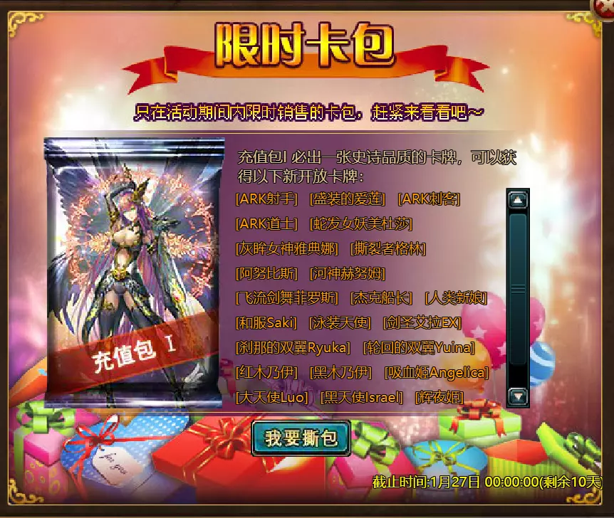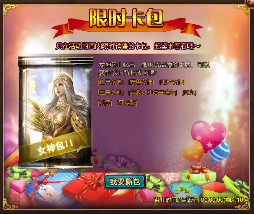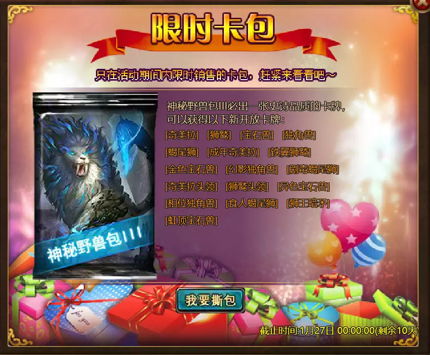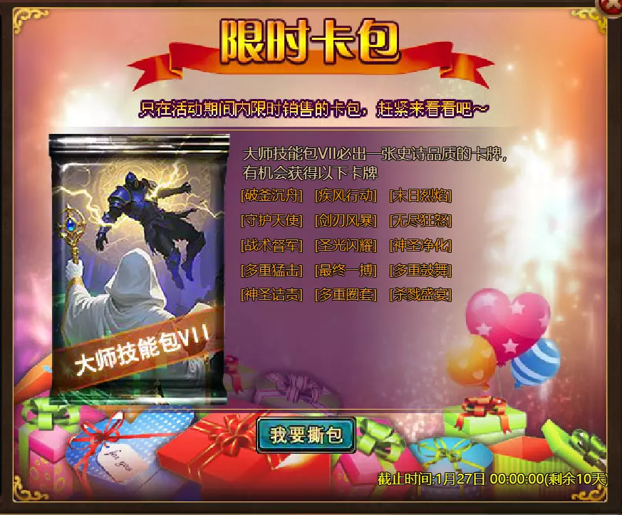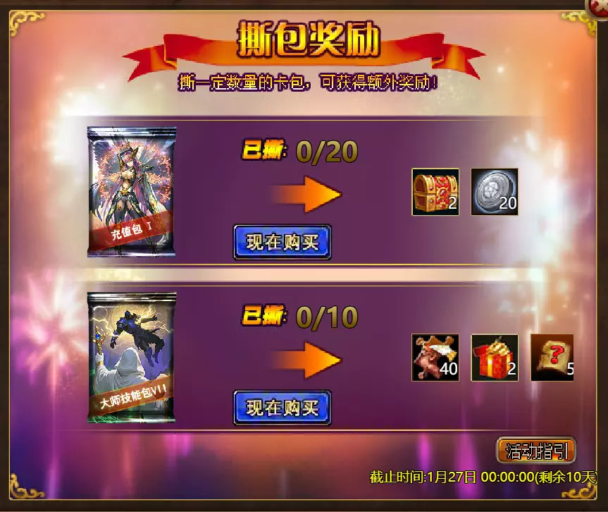 【维护公告】 各位玩家: 我们将于北京时间2026年1月20日上午9:30至11:30进行维护更新。具体维护进度可能会根据实际情况提前或延后,感谢您的理解。维护期间游戏将无法登录,由此带来的不便我们深表歉意。 本次维护主要内容如下: 【更新内容】 1. 新增季后赛1v1冠军时装及坐骑 2. 普通飞升塔新增自动功能 【活动内容】 1. 至高之战:丹妮卡·焰心 2. 红钻风暴:红钻*2000/恶魔宝箱*1/银币*50,000 3. 充值返利:烈焰翼使(史诗)*1/银币*100,000/宠物秘境券*2/黑暗冠军药剂*2/ tome hall ticket*2/红宝石碎片*5购买点数,获取奖励:8000 - 暗影之刃·死神(传说级)*1 / 30000 - 暗影之刃·死神(神圣级)*1 5.累计金币返利:10000 - 达尔王(传说级)*1 / 30000 - 达尔王(神圣级)*1 6.20日基金 7.传说商店 8.超值返利 9.塔罗奥秘(倒吊人逆位) 10.星辰事件 11.金币狂欢(周常活动) 消耗10000金币:火焰红宝石*1,太阳宝箱(传说级)*2,宠物愉悦*1 消耗30000金币:火焰红宝石*2,神圣宝箱II*2,银币*3000000 消耗50000金币:黑欧泊*1,太阳宝箱(传说级)*4,宠物愉悦*5 消耗70000金币:火焰红宝石*2,神圣宝箱II*4,银币*4000000 消耗90000金币:黑欧泊*1,神圣宝箱II*6,太阳宝箱(传说级)*6,银币*5000000 12.每日消费,领取奖励 消费100金币:融合催化剂*1,银币*10,000,塔楼门票*3 消费500金币:人类宝箱(稀有)*1,融合催化剂*2,地狱门票*2 消费1,000金币:宠物魔法领域门票*3,天使宝箱(稀有)*2,银币*50,000 消费2,000金币:月神宝箱(史诗)*1,饲料(传说)*10,地狱门票*5 消费5,000金币:宠物魔法领域门票*3,未绑定技能书碎片(良好)*10,火蛋白石*1 消费10,000金币:火红宝石*1,高级融合催化剂*1,银币*1,000,000【限时活动礼包】- 增益狂欢 - 2个专属礼包:神力宝箱II*2 / 银币*2,000,000 - 10个大师技能包VII:火焰鸟碎片*40 / 宠物盛宴*2 / 未绑定技能书碎片(优质)*5 - 20个头像包II:头像包II*10 / 银币*1,000,000 - 20个神秘野兽包II:蛋白石碎片*9 / 传说宝箱*2 / 银币*500,000 - 5个女巫包:能量药剂(10点)*3 / 法典大厅门票*2 / 银币*300,000 - 10个精英包:集结令*3 / 银币*800,000 14.宠物魔法领域 15.远古巢穴 16.卡尔萨觉醒 17.VIP地下城 18.铁匠大师 19.炼金术大师 20.30天登录活动 详情请见游戏内图片。活动内容以游戏内实际内容为准,官方拥有最终解释权。