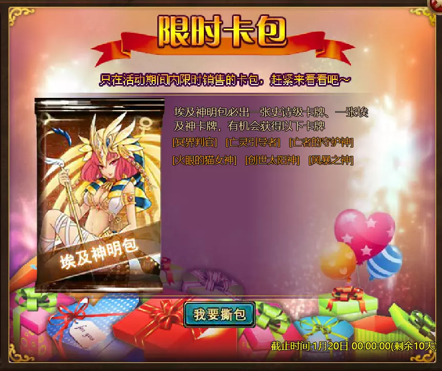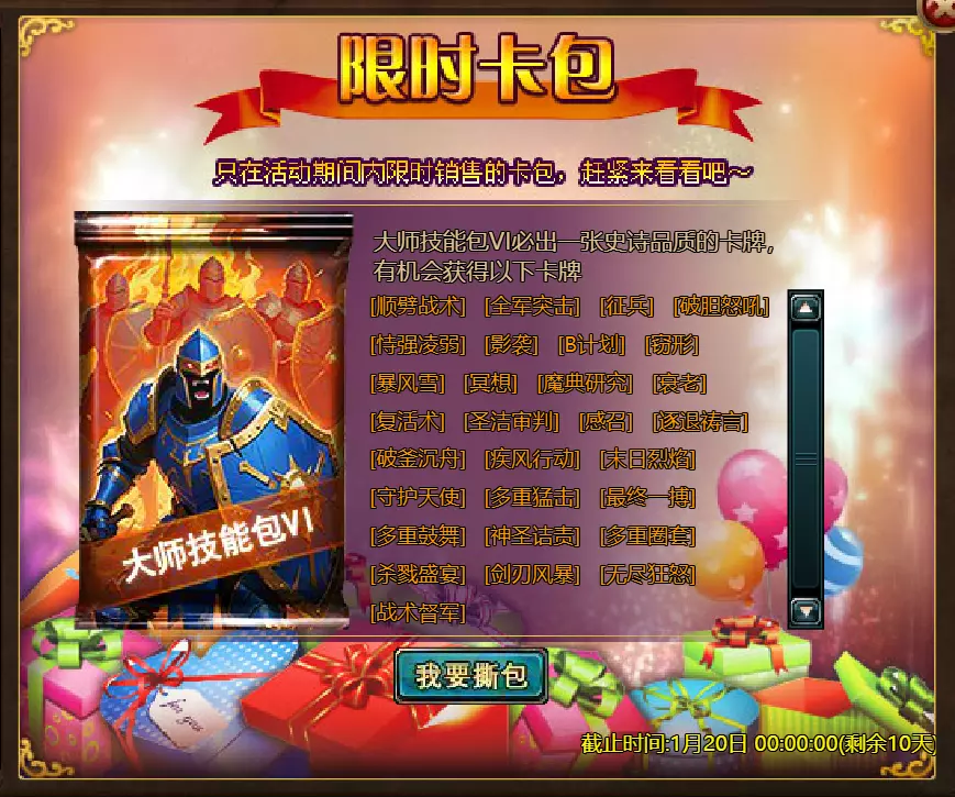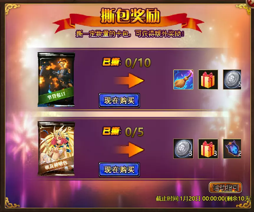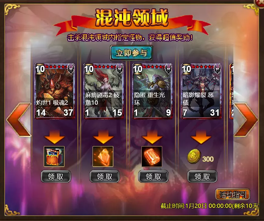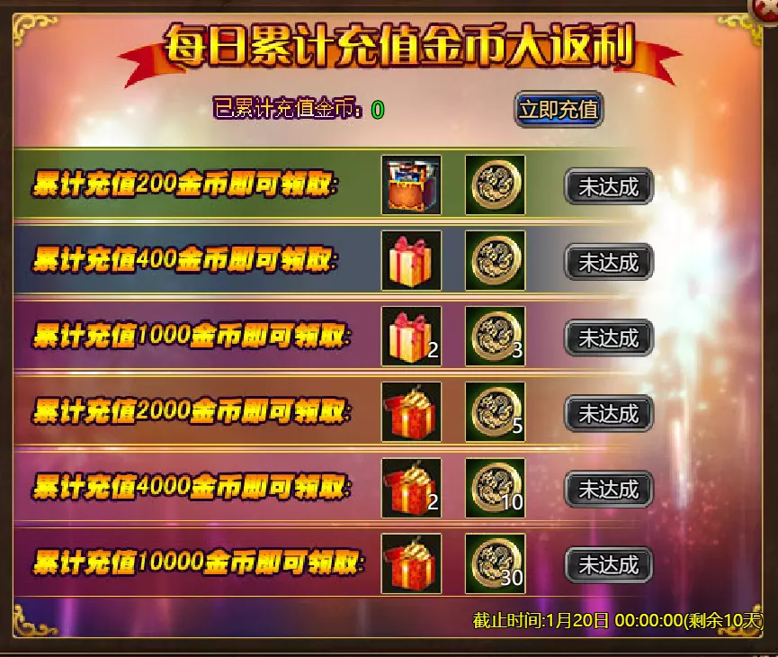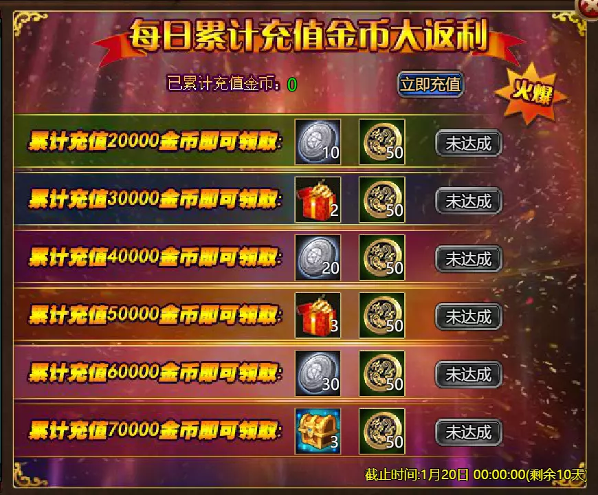 【游戏维护公告】 各位玩家: 我们将于北京时间2026年1月13日上午9:30至11:30进行维护更新。具体维护进度可能会根据实际情况提前或延后,感谢您的理解。维护期间游戏将无法登录,由此带来的不便我们深表歉意。 本次维护主要内容如下: 【更新内容】 1. 新增玩法【神秘宝箱】:添加了“神秘宝箱”功能。玩家可使用对应道具开启神秘宝箱并获得丰厚奖励,详细规则请在游戏内查看。 【修复内容】 1. 修复了【警戒】效果描述显示不正确的问题。 2.1. 修复了GSD后玩家无法退出公会的罕见问题。 2. 循环任务体验优化:调整了部分循环任务的出现概率和目标,优化了相关NPC的引导,使任务流程更顺畅。 3. 战斗界面优化:改进了战斗中符文技能的可用状态指示。当符文可用时,其按钮背景会以蓝色高亮显示,提供更清晰的视觉提示。 4. 世界场景显示优化:在世界场景中新增【隐藏玩家】按钮。玩家可手动开启该功能,隐藏场景中其他玩家的角色模型。 【活动】 1. 至高之战:大天使马克西姆斯 2. 红钻风暴:红钻*2000 / 天使宝箱*1 / 银币*50,000 3.充值返利:【权杖礁(史诗)】*1/银币*100000/【混沌废土门票】*2/【黑暗冠军药水】*2/【 tome 大厅门票】*2/【红宝石碎片】*5 4.购买点数,获取奖励:8000点-【布伦希尔德(传说)】*1/30000点-【布伦希尔德(神级)】*1 5.累计金币返利:10000金币-【凯妮(传说)】*1/30000金币-【凯妮(神级)】*1 6.7日基金 7.特别福利 8.超值返利 9.神话目录(夸父) 10.龙珠活动 11.黄金rush(周常活动) 消耗10000金币:【紫罗兰决斗者(传说)】*1、【太阳宝箱(传说)】*2宠物愉悦*1 消耗30000金币:火焰红宝石*2,神级宝箱II*2,银币*3000000 消耗50000金币:黑欧泊*1,太阳宝箱(传说)*4,宠物愉悦*5 消耗70000金币:火焰红宝石*2,神级宝箱II*4,银币*4000000 消耗900000金币:黑欧泊*1,神级宝箱II*6,太阳宝箱(传说)*6,银币*5000000每日消费,领取奖励 消费100金币:融合催化剂*1,银币*10,000,塔楼门票*3 消费500金币:人类宝箱(稀有)*1,融合催化剂*2,地狱门票*2 消费1,000金币:混沌荒原门票*3,天使宝箱(稀有)*2,银币*50,000 消费2,000金币:月神宝箱(史诗)*1,饲料(传说)*10,地狱门票*5 消费5,000金币:混沌荒原门票*3,未绑定技能书碎片(良好)*10,火蛋白石*1 消费10,000金币:火红宝石*1,高级融合催化剂*1,银币*1,000,000【限时活动礼包】- 增益狂欢 2个大师技能包VI - 大师技能包VI*10 / 银币*1,000,000 10个专家包V - 灾难龙碎片*40 / 宠物盛宴*2 / 未绑定技能书碎片(优质)*5 10个节日包 - 魔法扫帚(7天)*1 / 星光宝箱(史诗)*1 / 银币*500,000 5个埃及神祇包 - 宠物零食*3 / 法典大厅门票*2 / 银币*300,000 10个精英包 - 职业选择水晶*3 / 银币*800,000 14.混乱荒原 15.晋升之塔 16.灵魂神殿 17.VIP地下城 18.铁匠大师 19.炼金术大师 详情请见图片。活动内容以游戏内实际内容为准,官方拥有最终解释权。