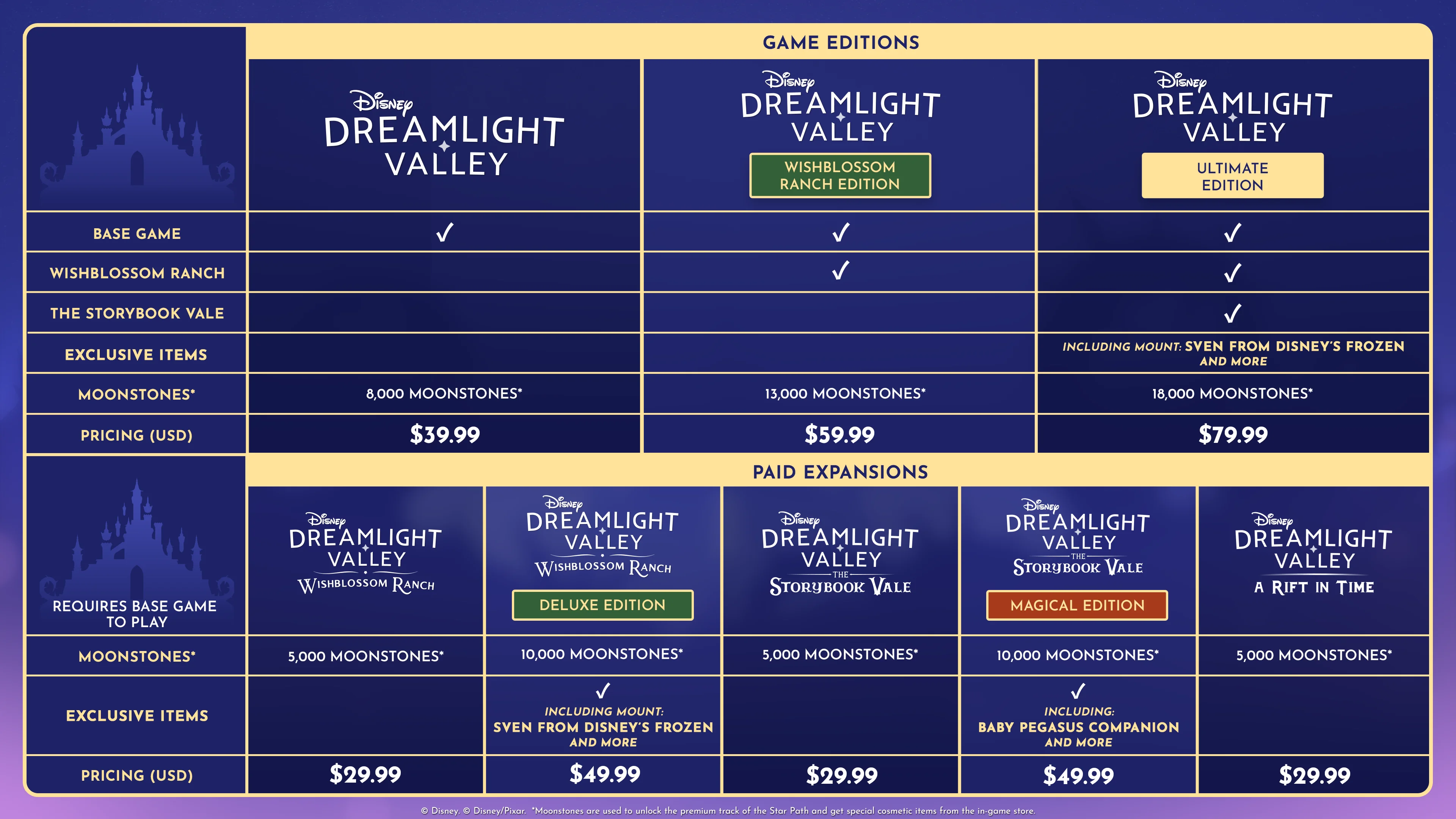 新版本与抢先体验奖励 【心愿花牧场扩展包】已作为独立购买内容向所有拥有基础游戏的玩家开放。 豪华版也将同步发售,包含额外月长石、独特房屋外观、两套马匹服饰、全新可骑乘坐骑、迪士尼《冰雪奇缘》中的斯文(克里斯托夫那只可爱忠诚的驯鹿)以及四项主题奖励。 街机版玩家可在首日免费获得【心愿花牧场扩展包】的访问权限。 新玩家还可选择直接购买包含基础游戏、【心愿花牧场扩展包】和额外月长石的【心愿花牧场版】,或包含基础游戏、【故事书谷扩展通行证】以及豪华版全部内容的终极版。在11月19日至12月3日期间购买任意版本的玩家,将通过游戏内邮箱收到专属奖励。