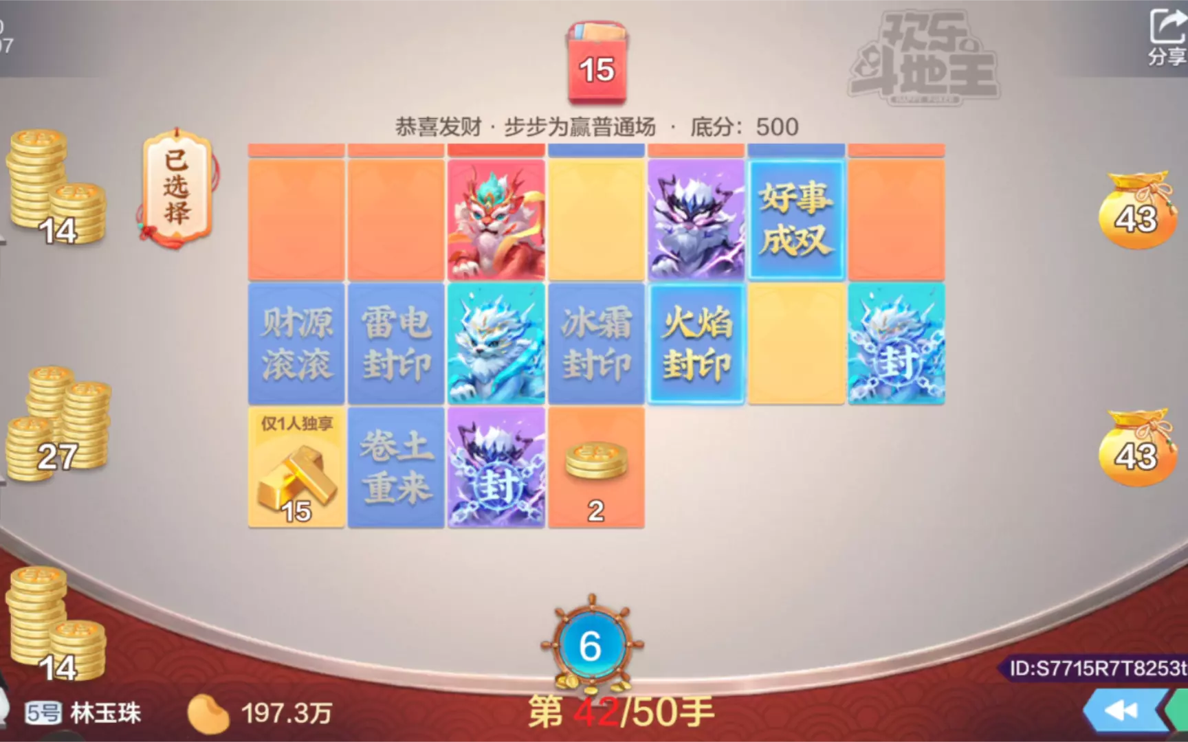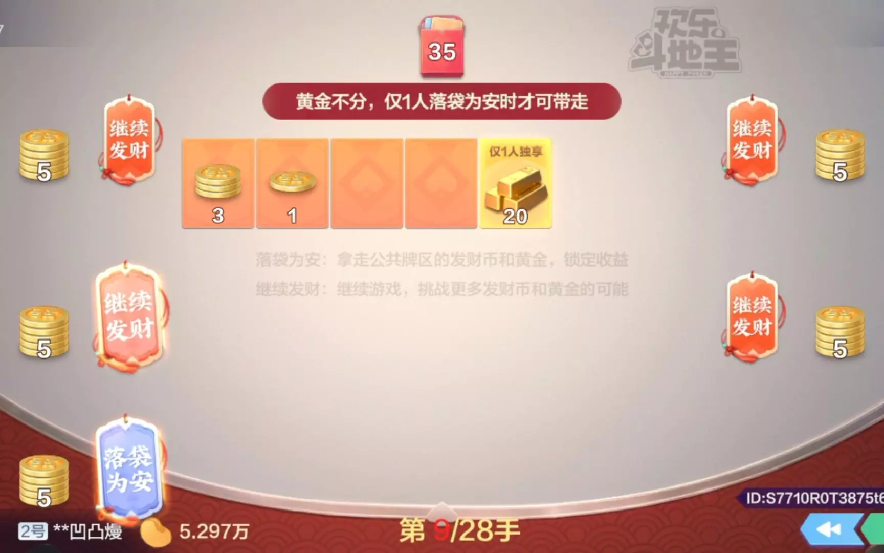 这是欢乐斗地主恭喜发财顶级场的对局,底分5万,对局门票3万豆,输赢封顶500万豆。对局中玩家可选择落袋为安锁定收益,或继续发财挑战更多奖励,还有发财卡分发发财币,全程充满博弈看点。
