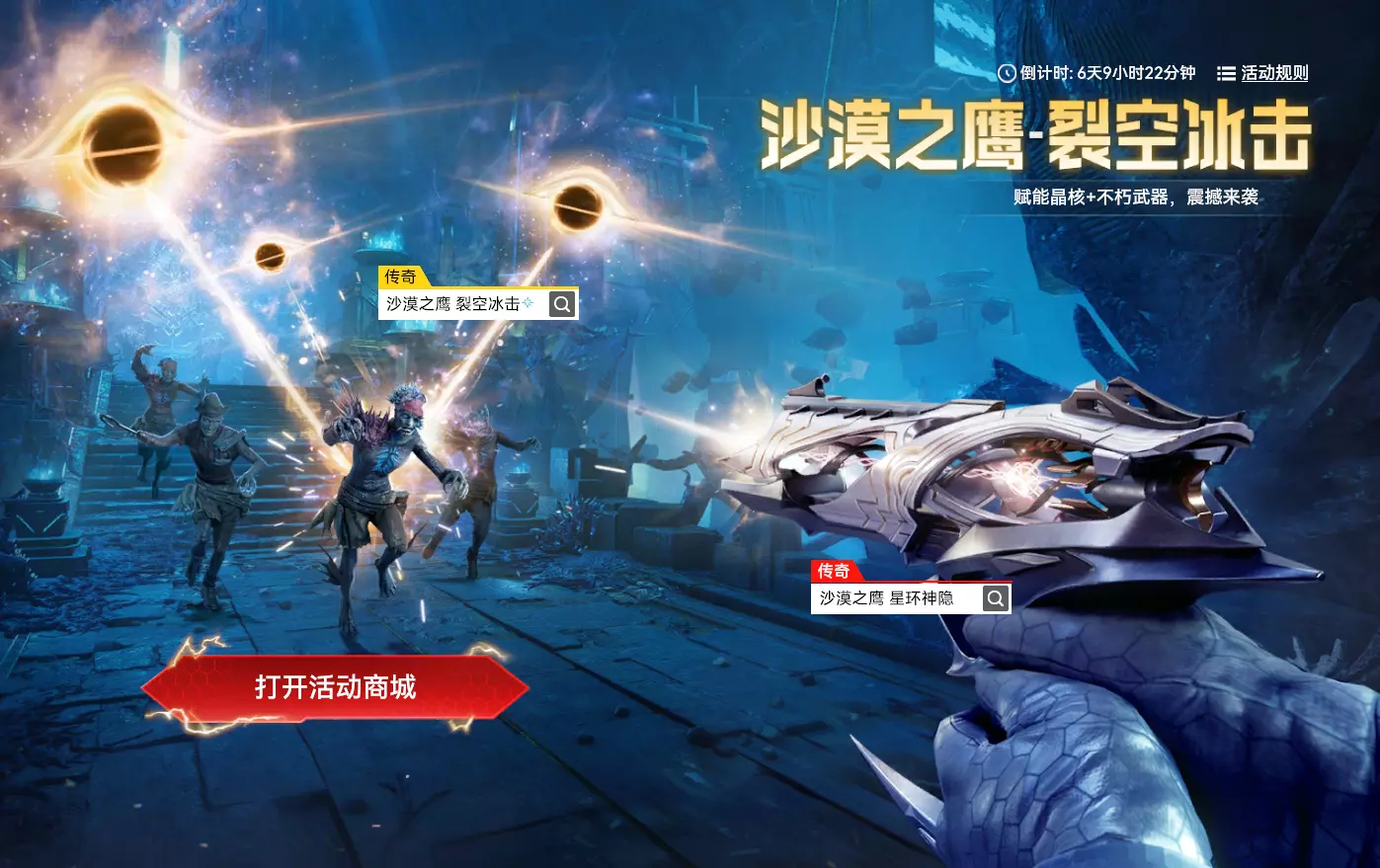 【沙漠之鹰 裂空冰击】 活动时间:2025年10月29日7点-2025年11月25日23点59分59秒 活动规则: 1. 活动期间,可花费10000沙鹰币兑换本活动商店内的物品。1点券可兑换1沙鹰币 2. 如单独购买/获得了大礼包内物品,将会按比例扣减礼包价格(如价格未及时刷新,请重进活动界面) 3. 活动结束后,沙鹰币将失效并清空,请及时兑换 4. 活动结束后,赋能晶核-裂空冰击将以原价上架商城 活动奖励: