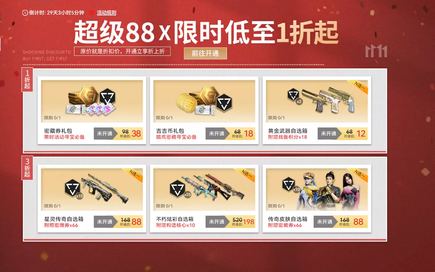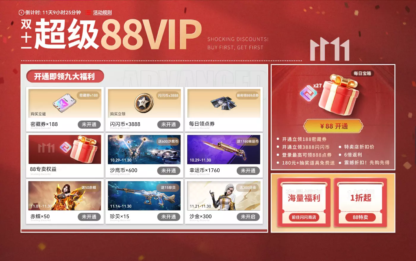 活动时间:2025年10月29日7点-2025年11月30日23:59:59 活动规则:开通88超级VIP的玩家,可在88VIP专卖店购买专属商品,未开通88超级VIP的玩家,无法在该专卖店购买任何商品 活动奖励: