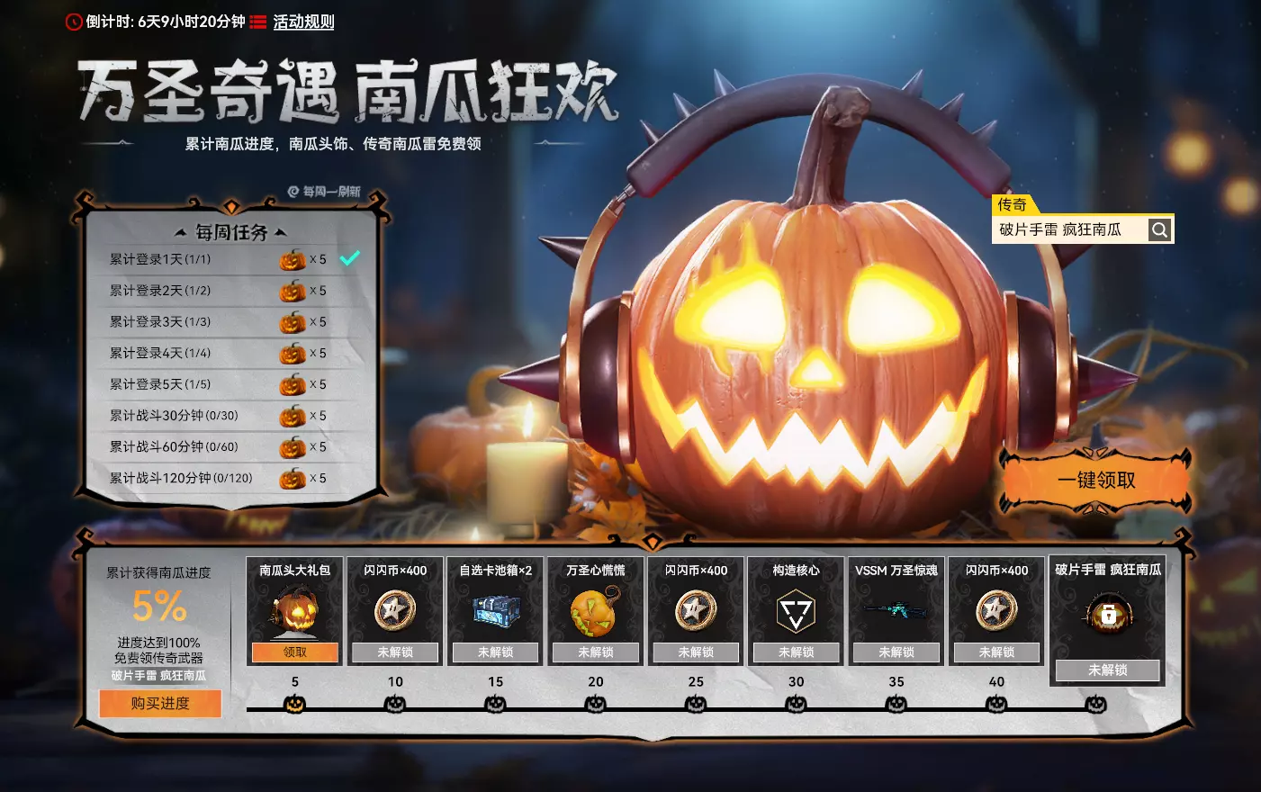 【万圣奇遇:南瓜狂欢】 活动时间:2025年10月29日7点-2025年11月25日23:59:59 活动规则: 1. 活动期间,完成每周任务可获得进度;累计进度达到对应目标可领取对应奖励 2. 11月19日开放进度购买,玩家可花费点券购买进度,多余的进度没有其余用途且在活动结束后将失效清空,请玩家谨慎购买 3. 【狂欢南瓜】为节日限定头饰,请及时体验(下个版本消失) 活动奖励: