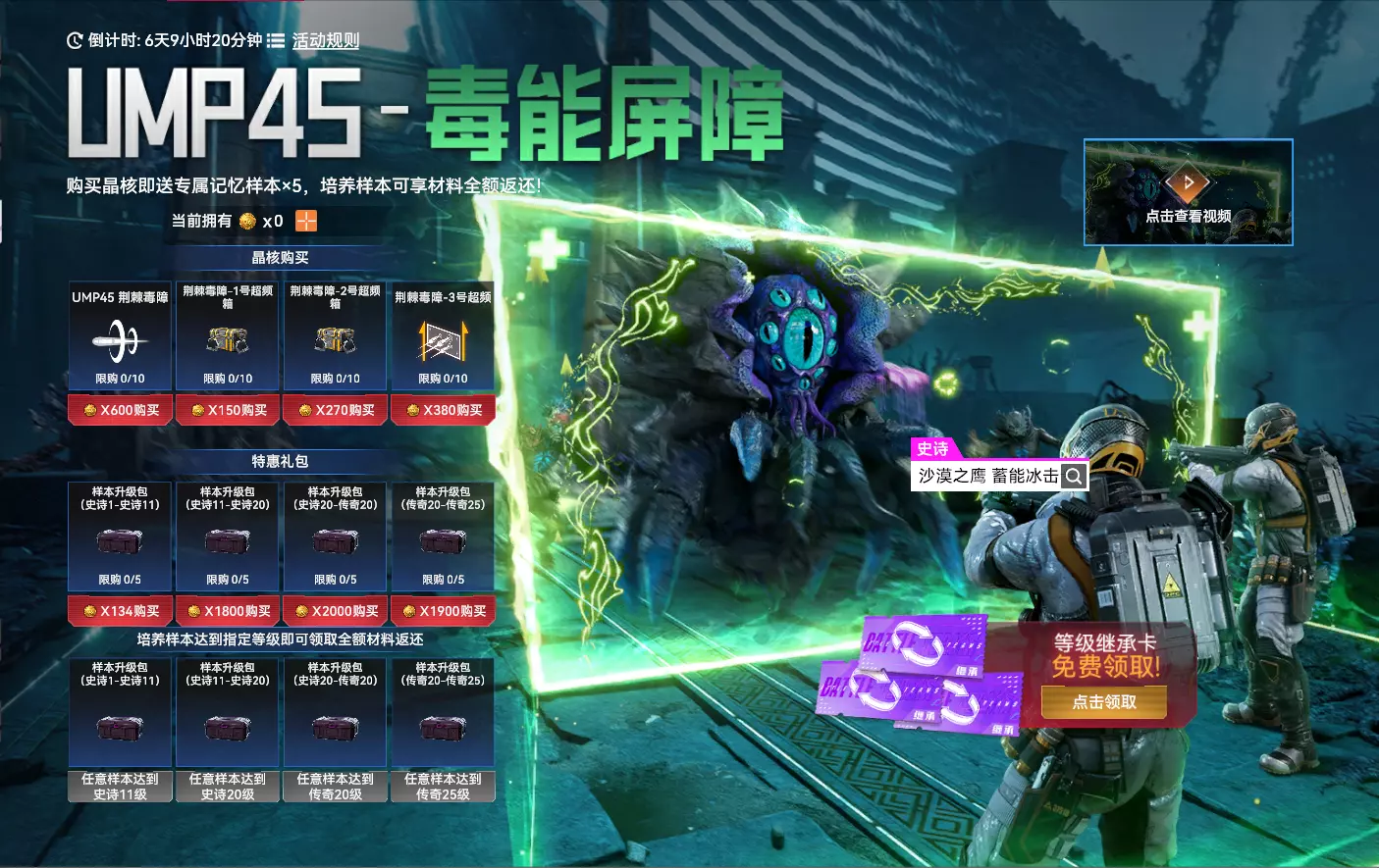 【UMP45 毒能屏障】 活动时间:2025年10月29日7点-2025年11月25日23:59:59 活动规则: 1. 活动期间,消耗拍卖币可兑换UMP45 毒能屏障、超频、培养礼包 2. 活动结束后,晶核、超频将会以原价上架商城 3. 活动期间,通过消耗材料提升UMP45 毒能屏障任意记忆样本等级达到指定等级,可获得材料返还(如使用等级继承功能导致升级任务无法完成,完成下一阶段升级任务后即可领取奖励) 活动奖励: