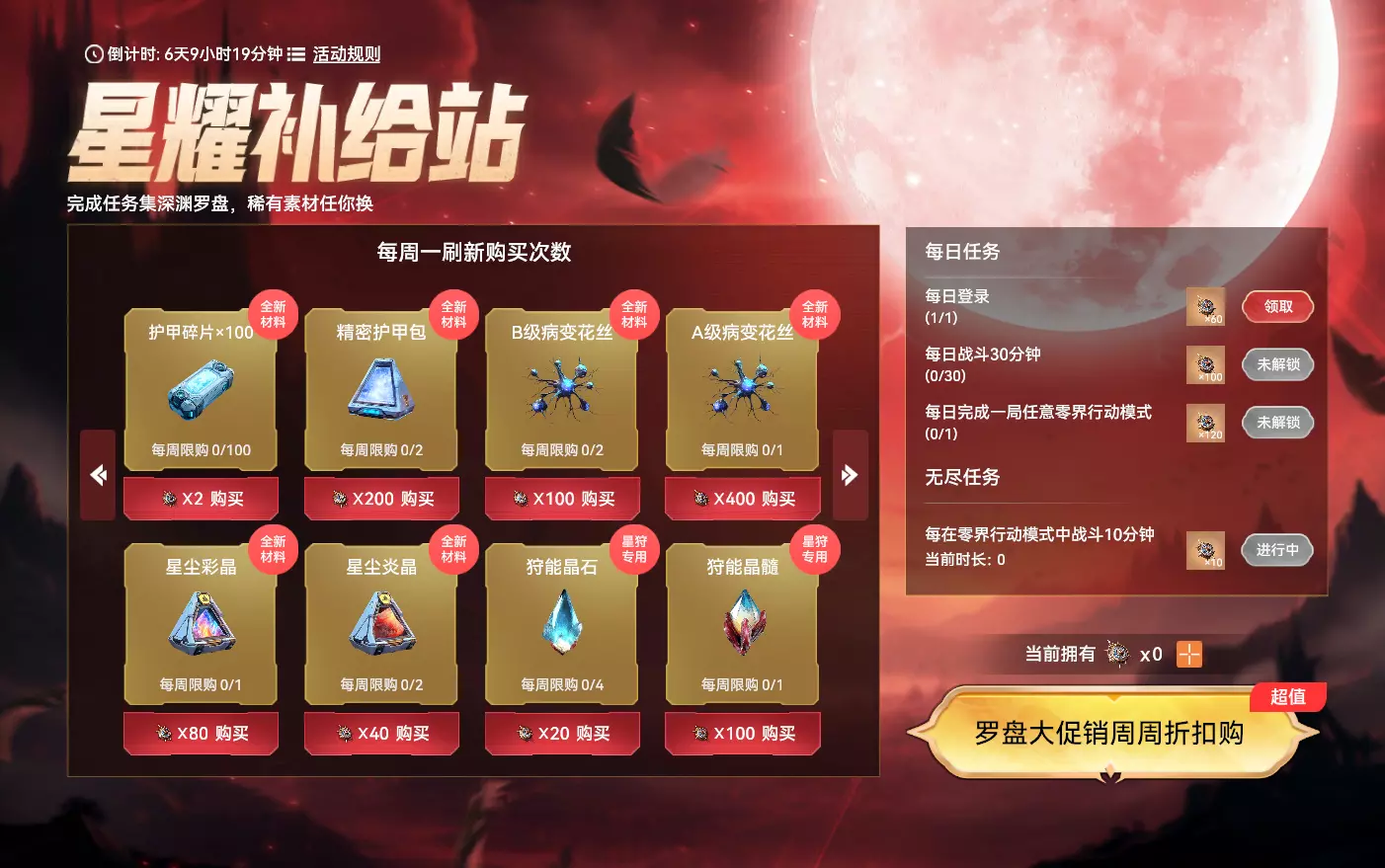 【星耀补给站】 活动时间:2025年10月29日7点-2025年11月25日23:59:59 活动规则: 1. 活动期间,完成任务可获得深渊罗盘:任务分为每日任务和无尽任务,每日任务每日0点刷新,无尽任务无刷新时间,可重复完成 2. 消耗深渊罗盘可在商城中兑换奖励。商城内的商品每周一刷新购买次数,请及时购买 3. 玩家可花费指定货币购买深渊罗盘(也可消耗1点券购买1深渊罗盘),每个档位有购买限制 4. 活动结束后,深渊罗盘会失效并清空,请玩家合理安排购买和消费计划 活动奖励: