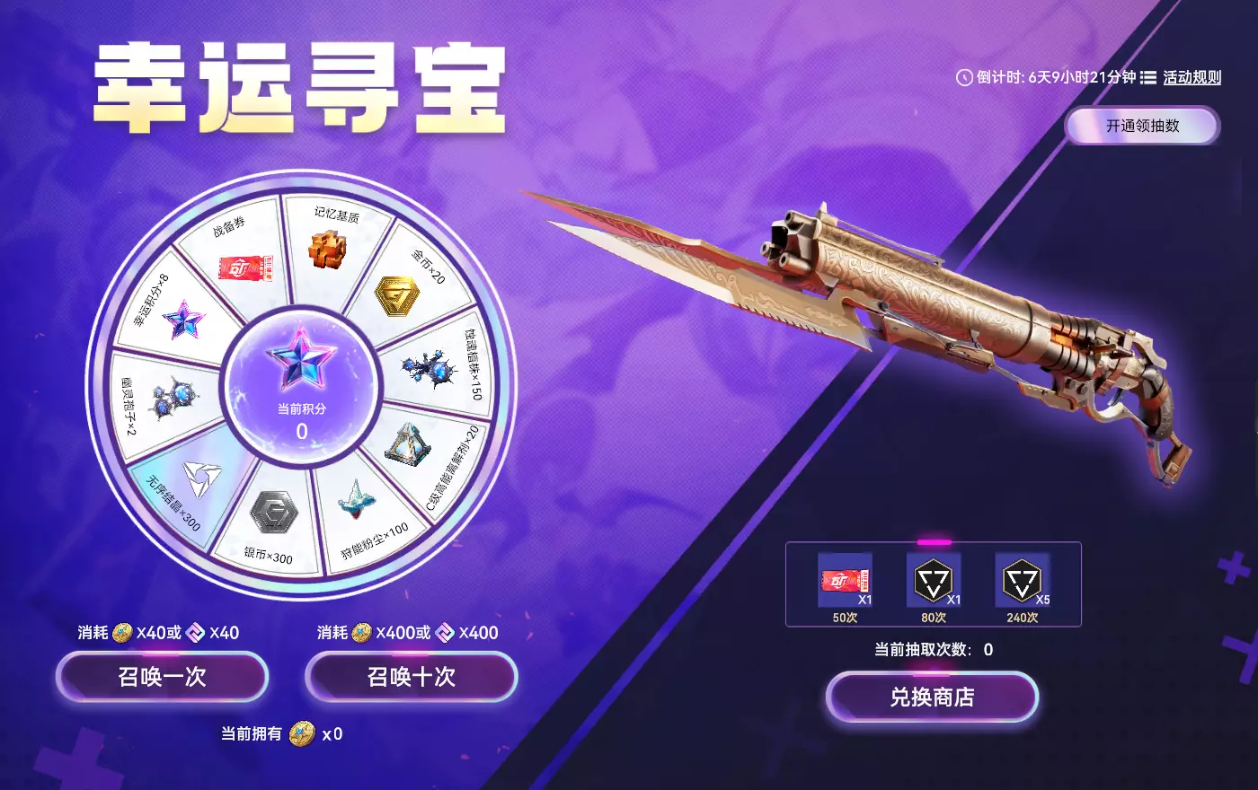 【幸运寻宝】 活动时间:2025年10月29日7点-2025年11月25日23:59:59 活动规则: 1. 每次寻宝消耗40幸运币或40点券,幸运币将于活动结束后过期 2. 寻宝时,当幸运币消耗完毕后,将继续消耗点券 3. 每次寻宝均会掉落1幸运积分,幸运积分可于商店中兑换奖励 4. 寻宝达到一定次数后,可以获得进度奖励,该奖励只能获得1次 活动奖励: