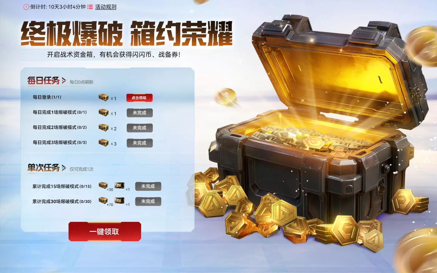 【终极爆破 箱约荣耀】 活动时间:2025年10月29日7点-2025年11月11日23:59:59 活动规则: 1.本次活动分为每日任务与单次任务 2.完成任务可获得战术资金箱、赛季深空解密卡等丰厚奖励 3.战术资金箱可获得奖励与概率如下:闪闪币x5(38.00%),闪闪币x30(25.00%),金币x5(15.00%),银币x500(10.00%),金币x10(10.00%),战备券x1(2.00%) 活动奖励: