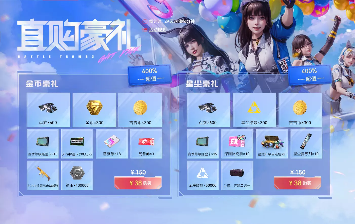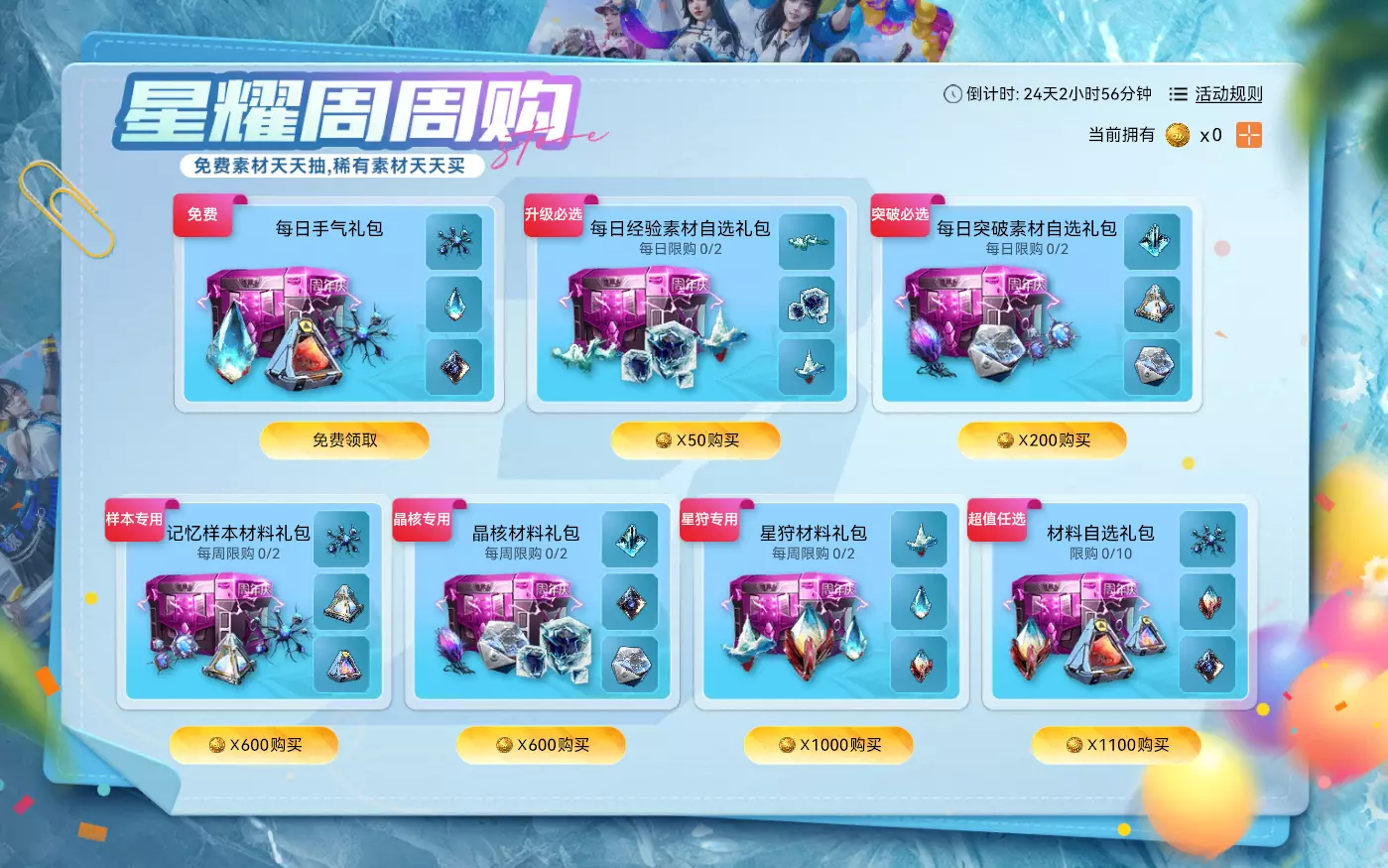 【星耀周周购】 活动时间:2025年10月29日7点-2025年11月25日23:59:59 活动规则: 1. 活动期间,玩家每日登录可抽取免费礼包一次 2. 活动期间,玩家可花费吉吉币购买对应的礼包 3. 材料自选礼包为活动期间内限购10次 活动奖励: