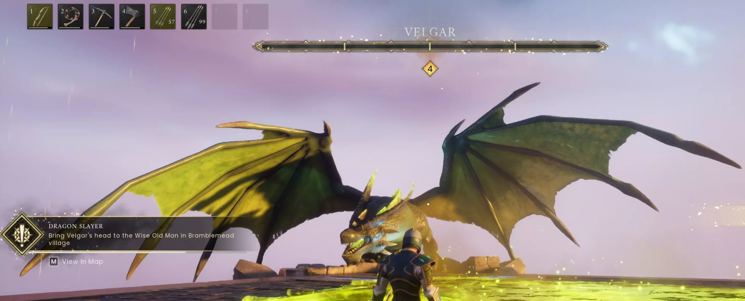 为了让战斗变得非常简单,你可以在战斗开始时喝下一瓶解毒药剂,并放置一两个守卫石。这场战斗出乎意料地简单,分为两个阶段——地面阶段和空中阶段。他会先从地面开始,在地面上停留大约5-10秒。