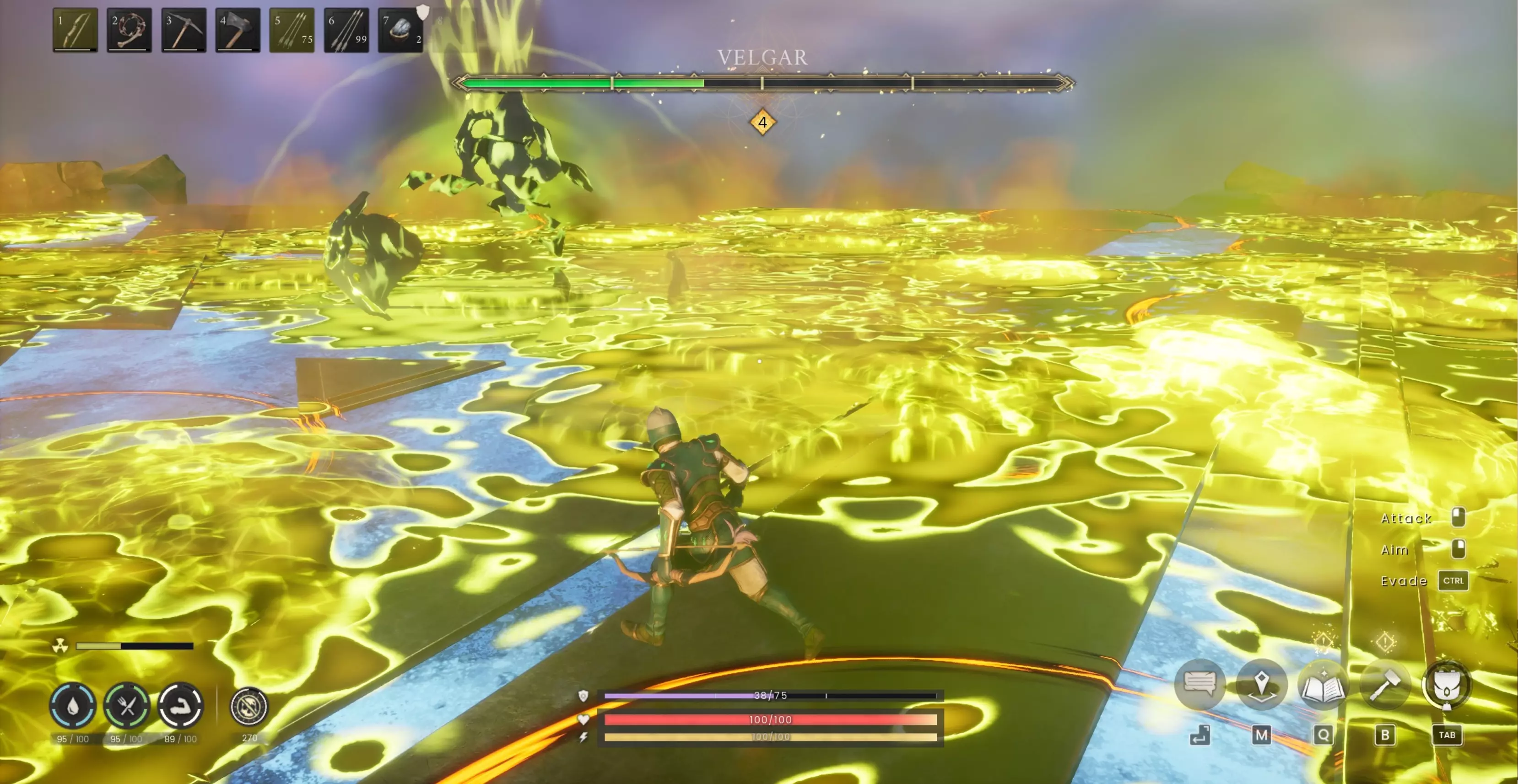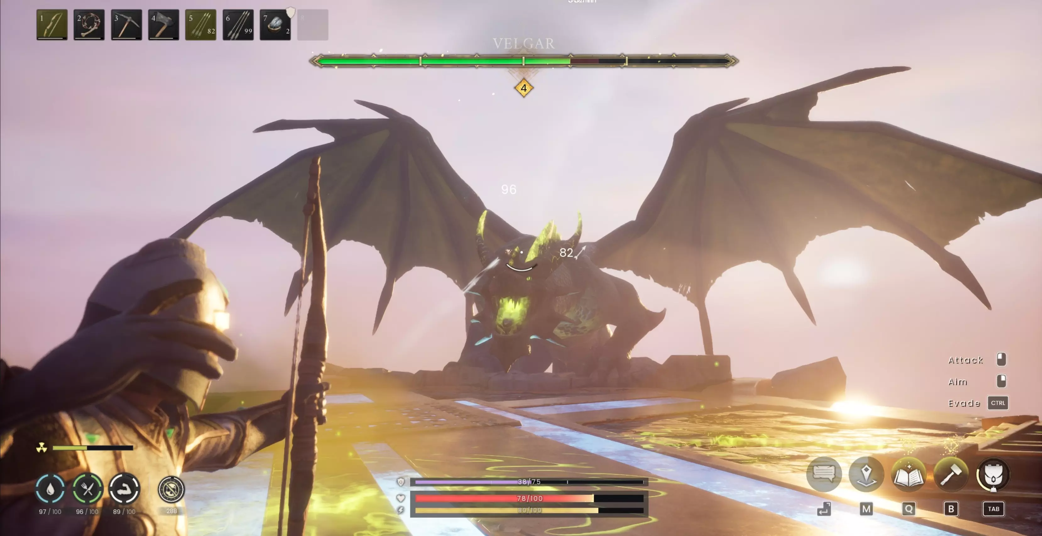 在地面阶段,Velgar 会处于以下几种状态:静止不动、在场地周围喷射毒液,或是使用地面猛击技能。 毒液吐息的动画是:他会把头向后仰,像是要打喷嚏一样,然后向你喷射毒液。如果你已经喝下抗毒药剂,就能完全抵消这造成的所有伤害,所以你完全可以无视它,继续对他进行输出。 地面跺脚的动画是:他会抬起两只爪子离开地面,然后猛地砸下去,产生一道尖刺冲击波朝你的位置移动。如果你被困在冲击波中且没有激活守护石,这可能会杀死你,所以要向左或向右翻滚以避免受到任何伤害。 在他的空中阶段,唯一的变化是他直接向你投掷的酒杯数量。在他的第一阶段空中阶段,会向你投掷3个酒杯。 在他的第二阶段空中阶段,会向你投掷4个酒杯。 在他的第三阶段空中阶段,会向你投掷5个酒杯。 在他的第四阶段空中阶段,会向你投掷6个酒杯。酒杯落地时若砸到你会造成伤害,所以要翻滚躲避(另外,你的抗毒药水无法让你免受此伤害)。 游侠:使用4级弓搭配铁箭可以大幅削减维尔加的生命值。在他回到1号位置时,他要么已经死亡,要么已濒临死亡。 持续对维尔加造成伤害,他撑不了多久。