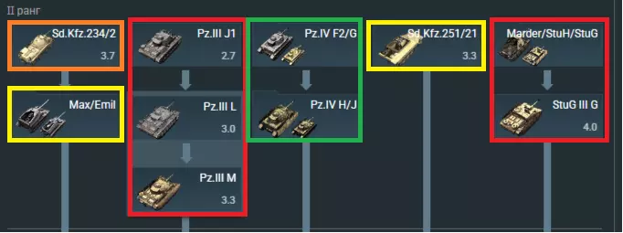 我们直接从“2级”开始讲,因为“1级”只要升级后就可以不用管了。不过值得一提的是,1级有一辆非常不错的金币坦克,那就是Pz.II C(DAK)。它在玩家中被称为“圆锯”。就像圆锯一样,它能毫不留情地摧毁所有敌人。 那么我们来看看“2级”。先从“四号坦克”系列说起: ⊳Pz.IV F2