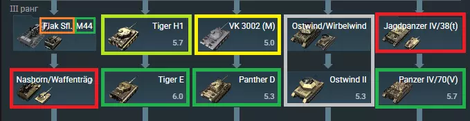 优点: √. 瞄准速度尚可,但对于高射炮来说远远不够。 √. 机动性与四号坦克相当。 √. Pz.Gr. H弹药可用于打击地面目标,Pz.Gr.弹药可用于打击空中目标。 缺点: ×. 没有装甲,因为底盘来自四号坦克。 ×. 射速不足,但勉强可以接受。 ×. 机动性一般。 坦克歼击车(最右侧科技树分支): ⊳猎豹G1/斐迪南
