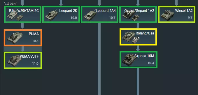 优点: √. 良好的机动性和灵活性。 √. 【SPO】(提醒你正受到照射)。 √. 第二代热成像仪。 √. 侦察无人机。 √. DM63穿甲弹。但由于是105毫米火炮,穿深降低1.5倍,仅为430毫米。 缺点: ×. 没有装甲。 ×. 无法将炮管向下压低。 ×. 初始状态下只能使用DM12穿甲弹。 ⊳PUMA/PUMA VJTF: