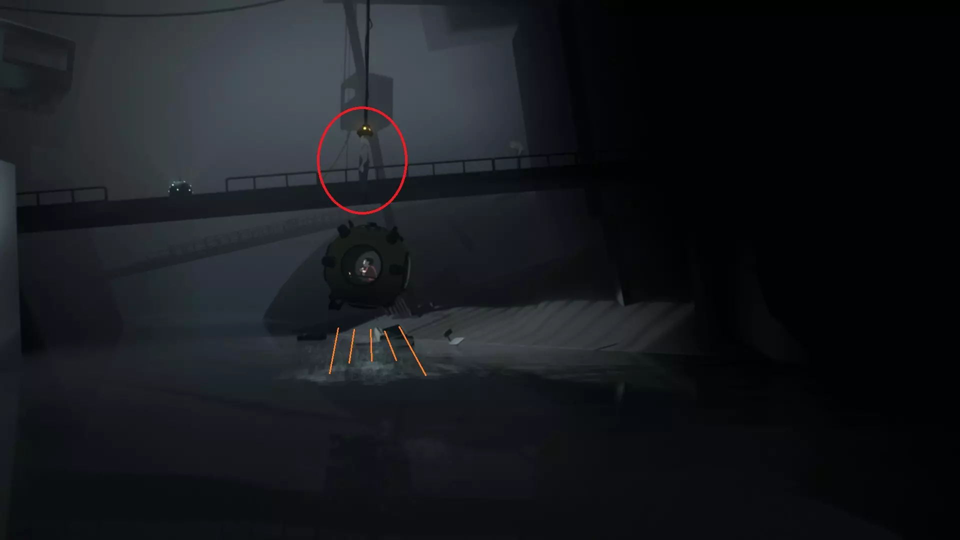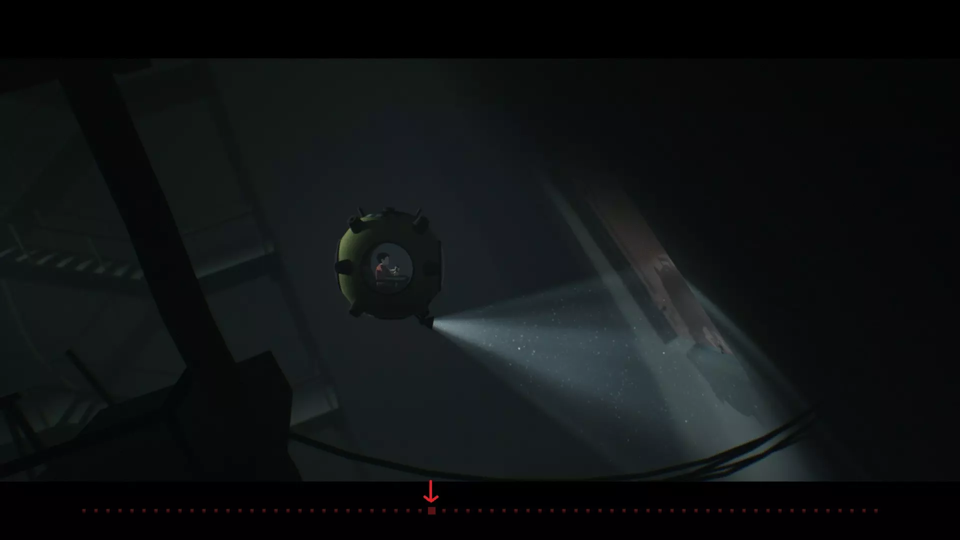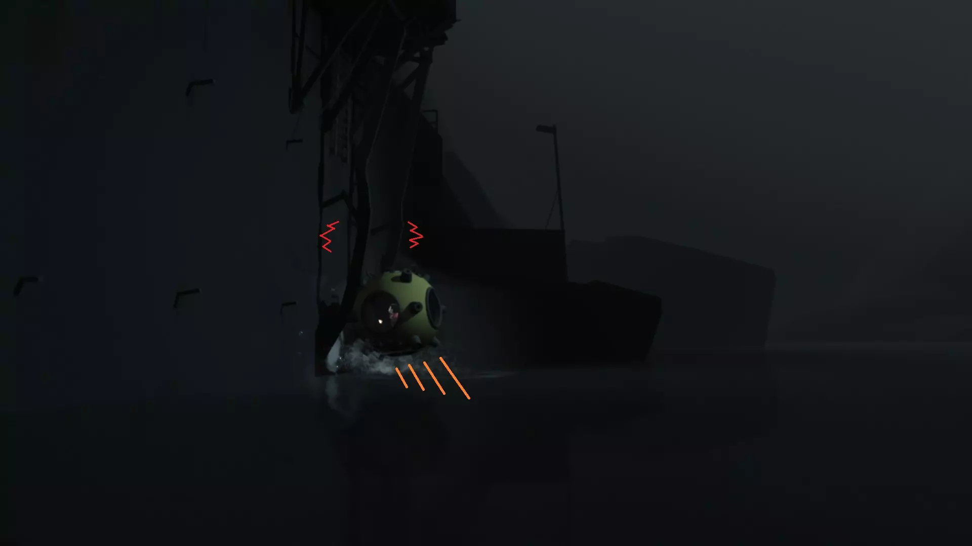 在场景32,向左回到潜艇中,驾驶潜艇一直向左行驶至尽头,会看到一副看起来不太结实的铁架。用潜艇弹起来撞击铁架两下即可。