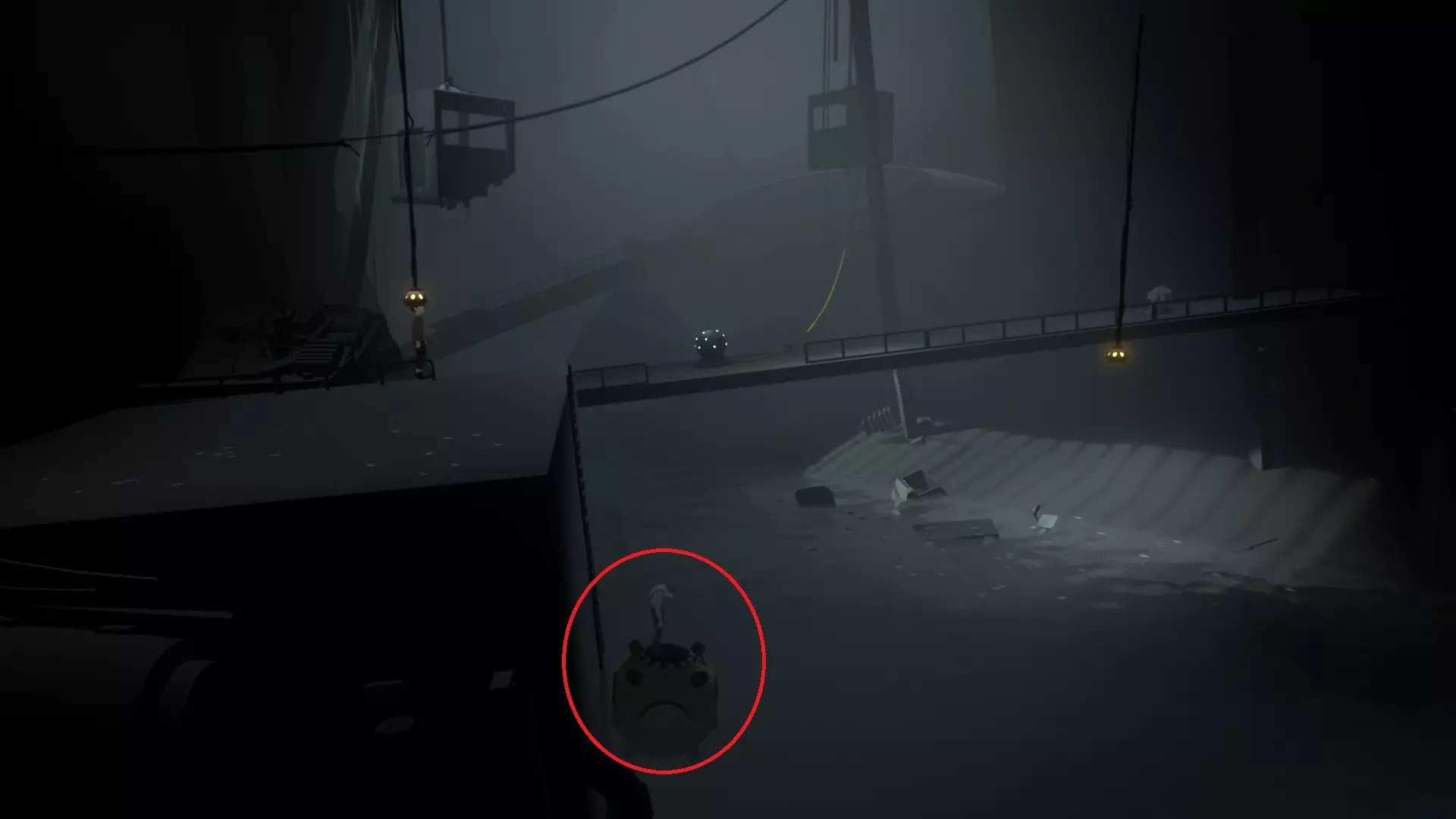 浮出水面后来到新区域,你需要控制小弟的下属才能间接接触到那个球体。戴上左侧的控制器,让第一个小弟跳到潜水艇上方。