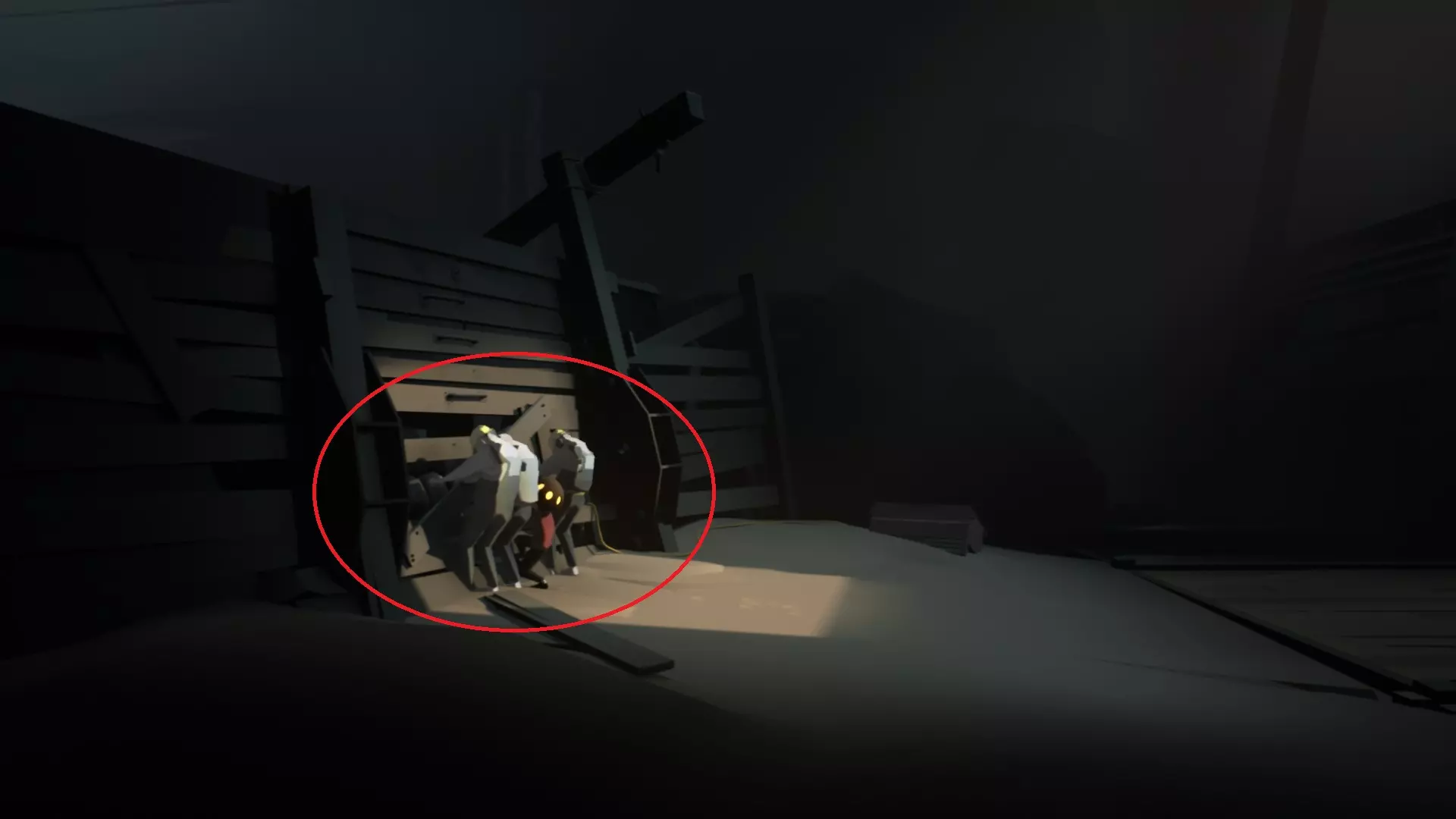 再往左走,救下3个同伴,然后回到这里,大家一起把木板拽掉。