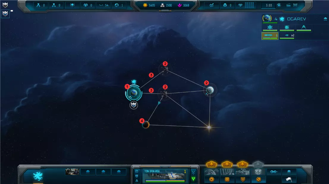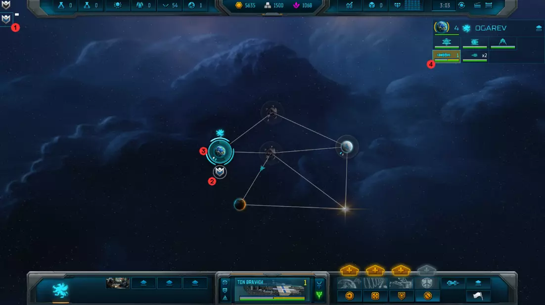 编号 描述 1 母星:这是你的母星。 2 中立星球:这些是中立星球(在本情况中为中立小行星)。 3 相位线:这些是【相位线】,你只能通过它们进行移动。 4 未探索星球:这是一颗未探索星球——派遣侦察机去发现那里隐藏着什么! 请注意,我的母星是蓝色的——这是我自定义的颜色,而中立星球是灰色的。此外,我的星球上方还有我的图标/标志。 如果我进一步缩小视角,将不会看到更多的星球。
