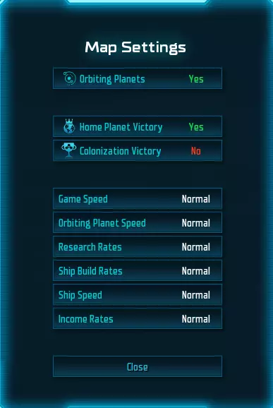功能 描述 轨道行星 新游戏功能:行星将围绕恒星旋转。这也意味着行星之间的相位线会发生变化,因为行星以不同的速度和方向运行! 母星胜利 你的起始行星现在是你的致命弱点。一旦失去该行星,你将输掉游戏。但这也能让游戏更快结束。 殖民胜利 启用此功能后,玩家/队伍一旦控制超过50%的行星即可获胜。这在大型自由混战模式中可能最为有趣。 游戏速度 改变所有事物的发生速度。这不会影响平衡,只是单纯加快游戏时钟速度。单人游戏中不太常用,因为你可以随时微调游戏速度——多人游戏中更有用,因为整个游戏期间你都只能使用相同的速度。 其他速度设置只会影响其特定领域。 玩家自定义 自定义你的帝国本身就可以算是一个小游戏。在这里你可以选择你的图标(旗帜)、颜色以及外交中使用的肖像。最棒的是——你可以直接看到根据你的自定义设置,你的舰队会是什么样子!