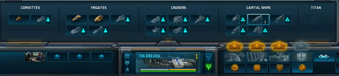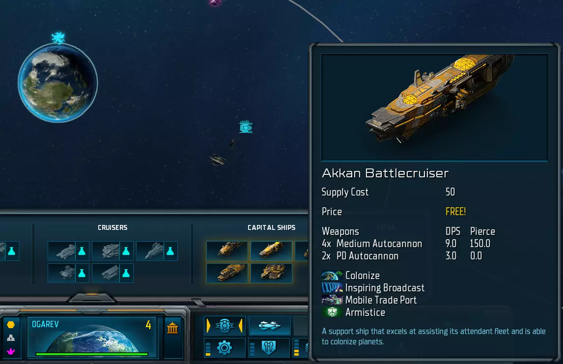 有两个重要的方面需要了解: 这里显示了你的主力舰所有可能的技能;每艘主力舰有4个技能。你可能已经注意到,第4个技能上方没有金色箭头。这是因为第4个技能始终是终极技能,只有达到6级后才能选择。 哦对了,你的主力舰是有等级的!它们通过击杀获取经验。请注意,你只需处于击杀发生的重力井内即可。主力舰不需要亲自摧毁目标。 你的第一个技能应该是“殖民”,因为它能让你殖民中立星球,同时提供少量经济加成。 即使对于熟悉《太阳帝国的原罪:叛乱》的玩家来说,这也是新内容。主力舰不仅拥有强大的技能,还配备了特殊的【模块】。我们将在未来的某篇指南中深入解释模块,但目前只需了解模块是特定于派系的。这意味着不同派系之间会存在一些差异,而不同种族之间则会有很大差异。 舰队 现在,我们需要时刻关注我们的【Akkan】,因此应该将其添加到【帝国树】(左上角)中。 为此,我们选择【Akkan】,将鼠标移至屏幕左上角,家园图标正下方,然后右键点击。
