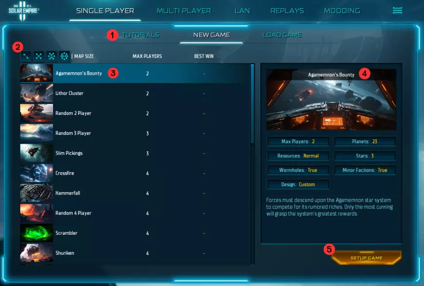 在【1】处你可以找到一系列实用的游戏内教程,它们将帮助你了解游戏的玩法。这些教程涵盖了从最基础的镜头控制到一些更复杂的帝国机制等内容。 不过,如果你想直接开始游戏,那就停留在“新游戏”标签页。在【2】处你能看到4个方框,它们代表着地图尺寸。《太阳帝国的原罪2》拥有大量地图,这些筛选器能帮你轻松设置出你想要的最佳游戏大厅。 注意:虽然玩家数量较少通常意味着地图较小,但这些筛选器实际上是根据玩家数量进行筛选的。 在【3】处你可以看到当前选中的地图“阿伽门农的 bounty”。这一行还包含了最大玩家数量以及你在该地图上获得的最短胜利时间(最佳胜利)信息。[4]处有关于所选地图的详细信息。具体数据不言自明,但在成为资深玩家前,建议查看【资源】标签页,它会提供关于该地图玩法的关键信息。 最后,在[5]处我们可以开始创建大厅。 接下来会弹出一个菜单,你可以在其中设置大厅。