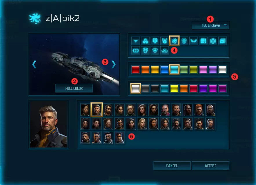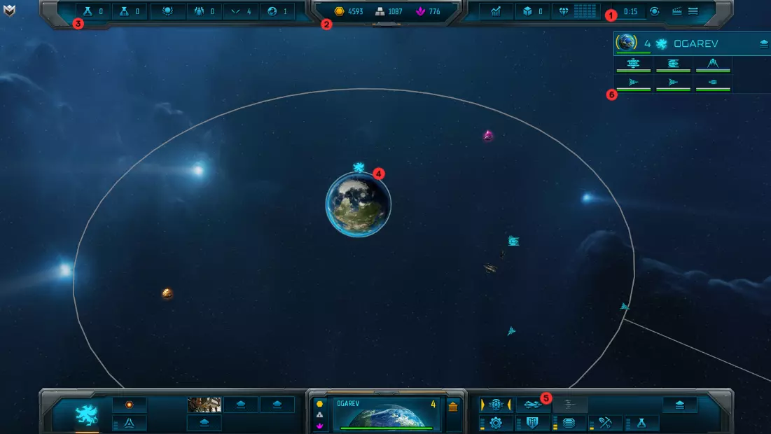 编号 说明 1 派系:点击此处选择你想游玩的种族和派系。 2 色彩强度:切换色彩强度(低色彩强度将更接近《太阳帝国的原罪:反叛》风格)。 3 舰船:循环浏览舰船,查看它们在当前设计下的外观。 4 图标:这将是你的图标(类似旗帜)。 5 颜色:允许你混合不同颜色(主色和副色)以获得独特设计。 6 头像:允许你选择头像,该头像将在外交时展示给其他玩家。 现在,让我们选择TEC流亡舰队并点击“接受”按钮。从那里你可以启动游戏,最终进入太空战斗的世界。 游戏开始 乍一看,你的游戏屏幕会有很多元素。不过别担心,我们会逐步讲解。 以下截图重点展示了你在太空迈出第一步所需的最重要内容: