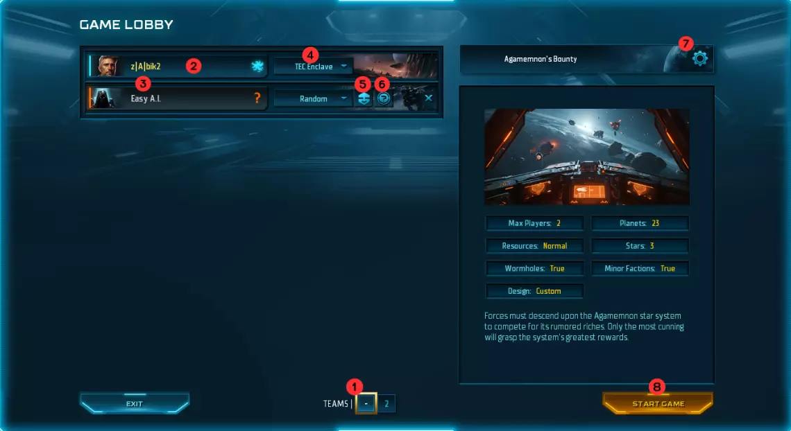 如果你想尽快开始游戏,只需点击【开始游戏】[8]。但对于你的第一场游戏,我推荐选择人类势力,因为他们的设计最为直观。毕竟他们是人类,而非外星人。如果你选择这个快速选项,可以直接跳转到“游戏开始”部分。 以下是菜单的详细说明: 1. 自动组队:选择队伍数量(由于这是小型地图,最多可设置2支队伍)。 2. 玩家自定义:详情将在后续讨论。 3. AI类型:显示难度等级和类型(请参考下方第5点和第6点)。4 阵营:点击此处选择你想要游玩的种族和阵营。 5 难度:点击此处切换AI难度等级。鼠标悬停可查看详情——难度越高,AI将获得作弊加成。 6 类型:点击此处切换AI性格。鼠标悬停可查看详情——你可以将AI玩家设置为更偏向防御、进攻、经济等类型。 7 选项:允许你更改游戏内设置。 8 开始游戏:使用你选择的选项开始匹配。 当你对设置感到满意后,可以查看【7 选项】进行更多微调。