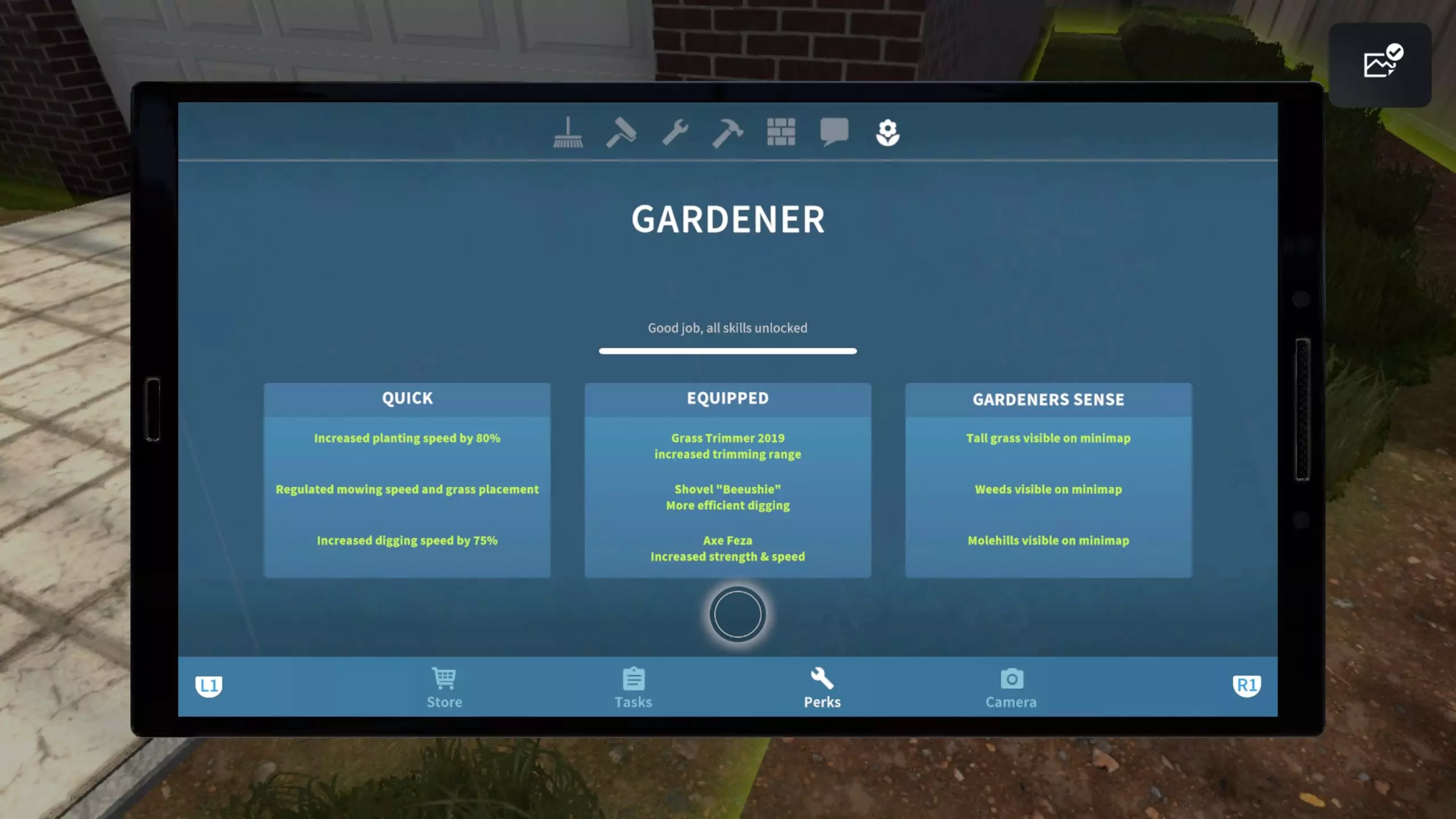 技能 《房产达人》提供角色养成系统。随着完成更多订单,你的经验值会提升,并获得不同类别的技能点(Perks):绘画、清洁、拆除、谈判。可通过平板查找并购买升级项。 若拥有园艺DLC,还将获得额外的园艺技能可供升级。 技能升级越多,完成工作的速度就越快。建议优先升级【更高报酬】【更好的拖把】【巧手】,这样能获得更高报酬、更快清洁速度,并加快水槽等物品的组装速度。