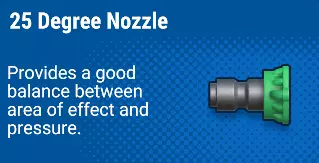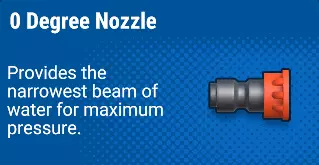 另一个能完成任务的常用喷嘴。它具备三个关键要素:射程、威力和扩散范围。当绿色喷嘴力不从心时,黄色喷嘴便会登场,提供强力喷射。该喷嘴能够清除铁锈及其他顽固污渍,但对付油污仍有困难。 尽管黄色喷嘴的扩散范围小于绿色喷嘴,但其更优的射程和威力使其能有效应对顽固污垢和远处表面。 在后期那些顽固污垢四处飞溅的任务中,黄色喷嘴将是完成工作的最佳选择。 红色(0°)喷嘴