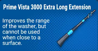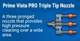 三重尖端喷嘴是Prime Vista PRO独有的清洗机专用喷嘴。 它是目前最出色的喷嘴。拥有红色喷嘴的射程和威力,但其扩散范围是红色喷嘴的三倍以上。使用“扫射法”,这个喷嘴能以极快的速度完成所有清洁工作。 三重尖端喷嘴清洁表面的速度和可靠性甚至超过黄色喷嘴。 【注意:长时间使用“扫射法”可能导致手腕疼痛或受伤。请谨慎使用,并在需要时休息。】 短延长杆