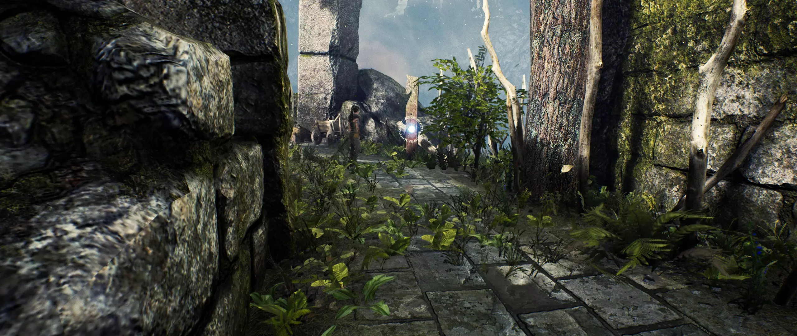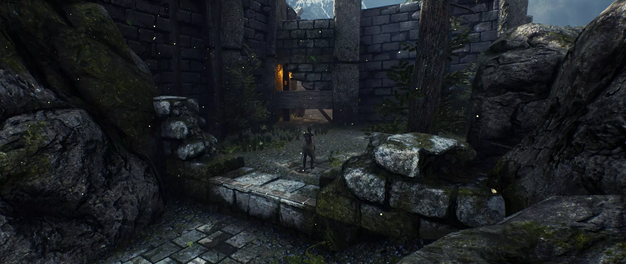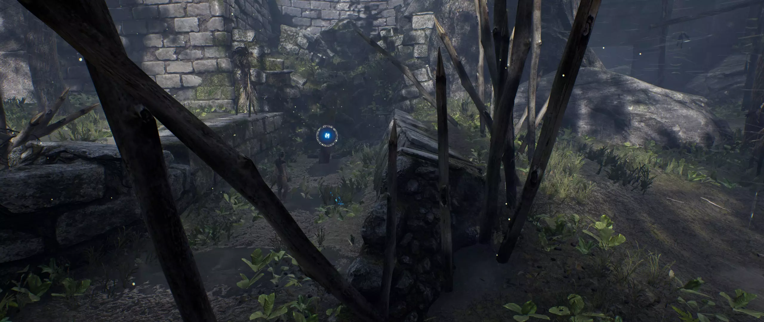 你刚穿过门。一直往前走,然后将镜头转向右边。你会看到带有【石头】的废墟。