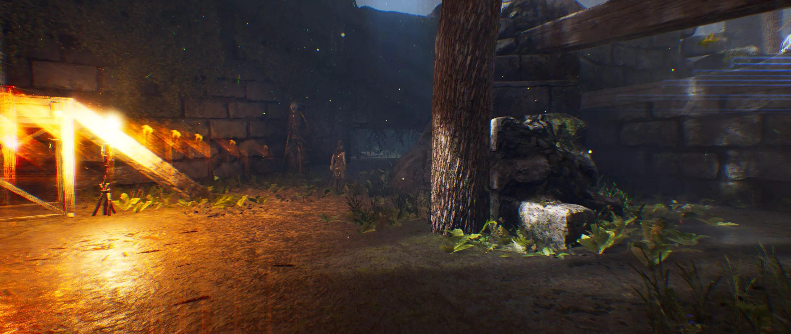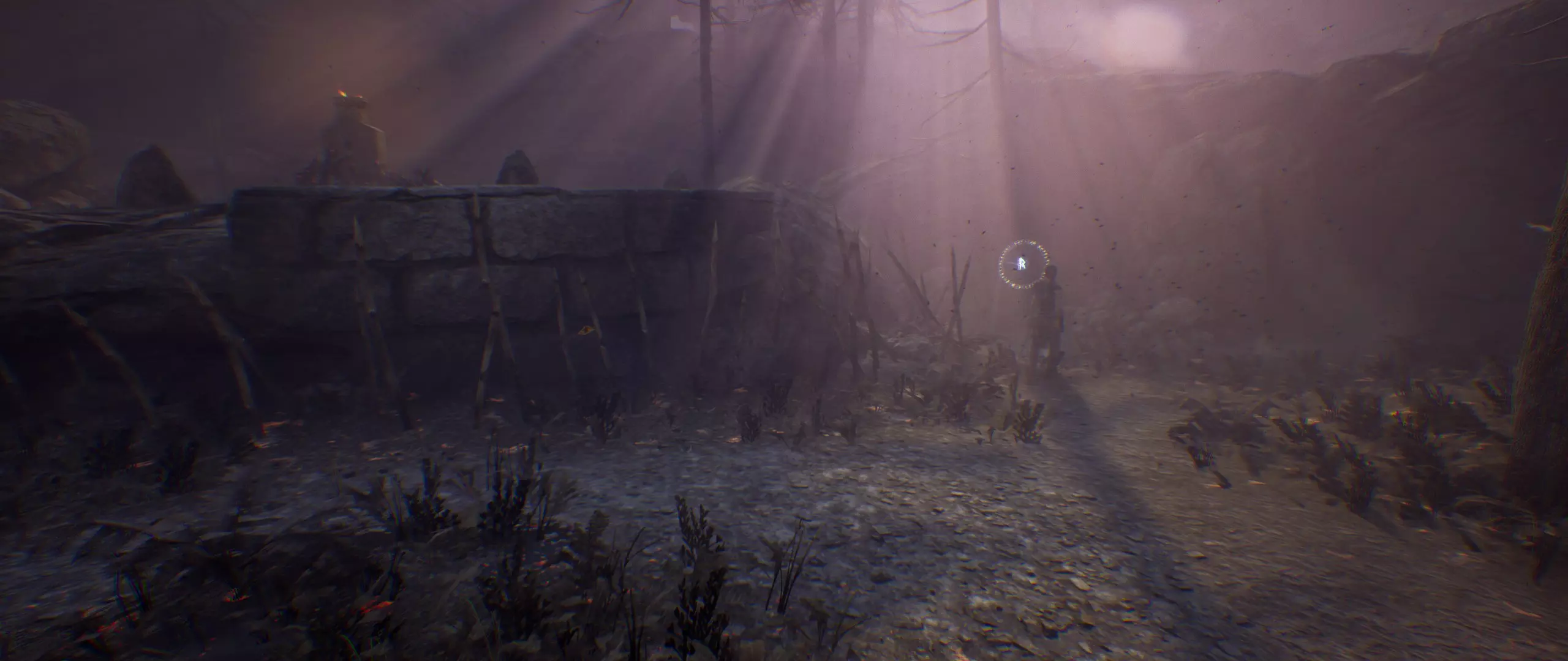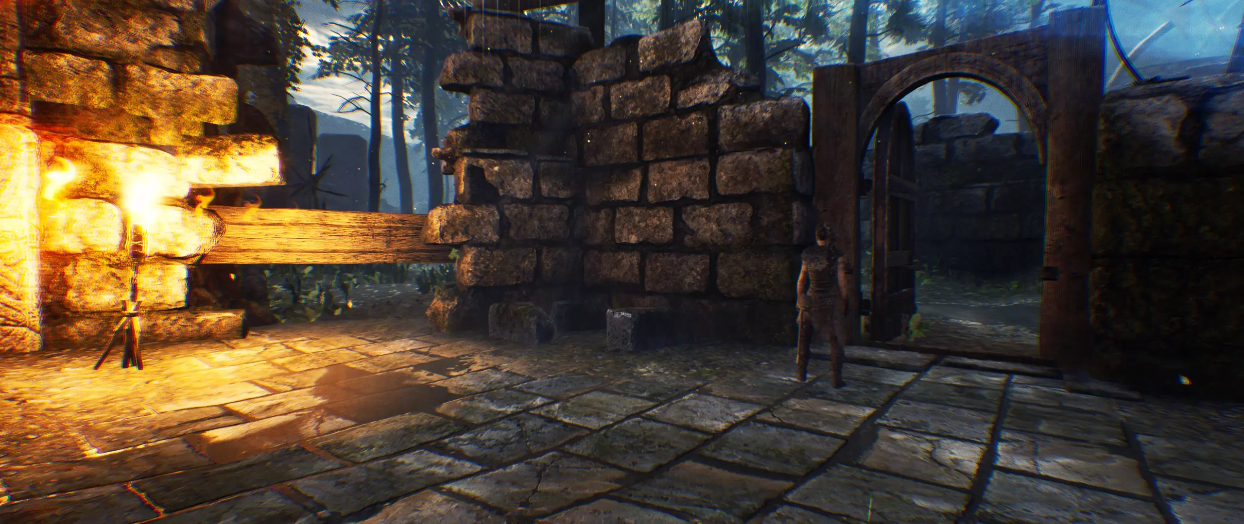 你刚穿过门。一直往前走,然后将镜头转向右边。你会看到带有【石头】的废墟。