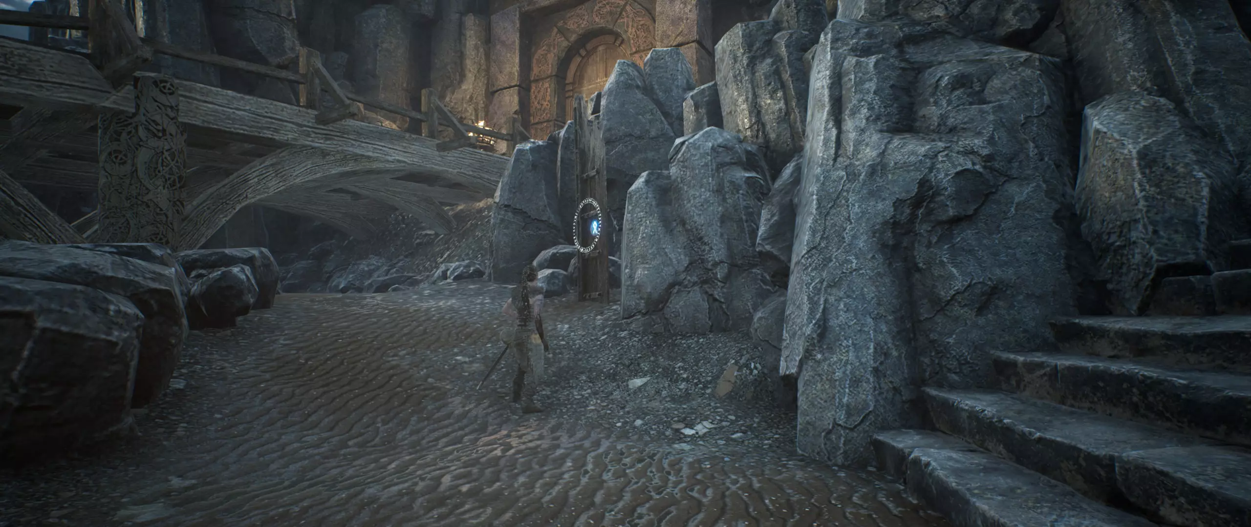 你站在这扇门前,需要找到3个符文。沿着你右侧的楼梯向下走。