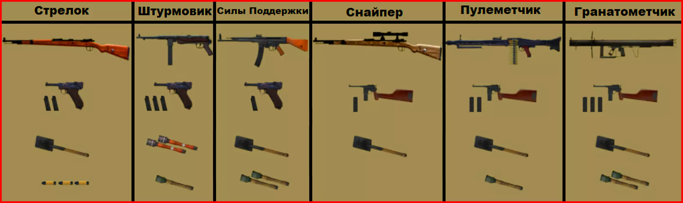 装备。所有基础职业的副武器栏均配备了手枪。 所有特殊职业的副武器栏配备了毛瑟C96或M1卡宾枪。 所有类型的手榴弹和火箭弹数量大幅增加。 除掷弹兵外,所有职业的主武器弹药量减少。 M1加兰德的射速提升40%。 BAR的伤害从50提升至64。 STG的伤害从50提升至55。下图展示了所有职业可获得的装备,美国阵营的职业也会获得相应的同类装备。同时请注意,游戏中选择职业时显示的装备是不正确的,您实际获得的装备以上图所示为准。